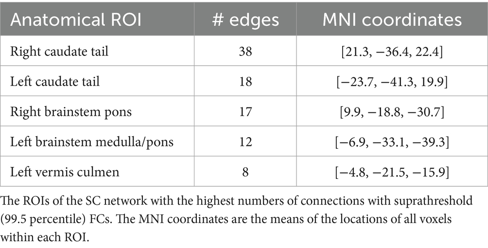 We selected the top three percent of ROIs based on their suprathreshold DP edge count to identify the nodes that contributed most to identification. All of these nodes were categorized within the SC network (Table 1). Interestingly, the top two nodes were contralateral ROIs, left and right caudate tail, which had 38 and 18 high-DP connections, respectively (the two largest yellow spheres in Figure 4c). Most of the right caudate tail’s suprathreshold FCs were to ROIs of the visual system networks (VIS and VA) bilaterally and the right frontoparietal network (Figure 4b). The two caudate regions were followed by ROIs from the brainstem and the cerebellum. Specifically, one ROI encompassed the pons in the right hemisphere of the brainstem; another included both the pons and medulla in the left brainstem, and a third spanned the culmen of the left cerebellar vermis (Table 1), all of which contained both inter- and intra-hemispheric edges.
