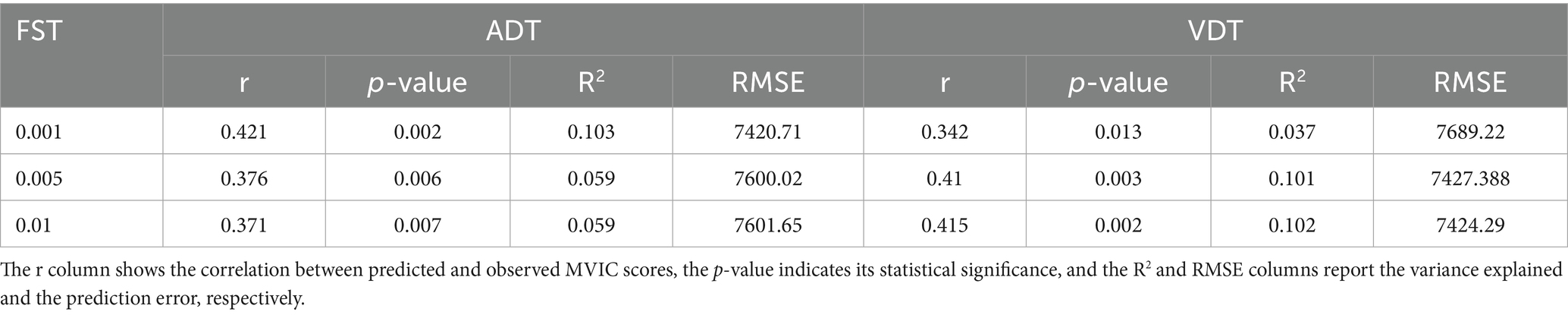 For each FST value, the correlation between the predicted and observed MVIC scores was computed. As shown in Figure 5a and Table 2, the CPM model achieved statistically significant prediction accuracy across all thresholds (p < 0.05). These results demonstrate that CPM can predict individual differences in MVIC with statistical significance, and this performance is stable and not dependent on the specific FST applied (Table 2). Using ADT connectomes, the best prediction accuracy was obtained at FST = 0.001, yielding a correlation of r = 0.42 (R2 = 0.103; RMSE = 7420.71, p-value = 0.002). For VDT connectomes, with an FST = 0.01, the correlation coefficient between predicted and observed MVIC values was 0.415 (R2 = 0.102; RMSE = 7424.29, p-value = 0.002).
