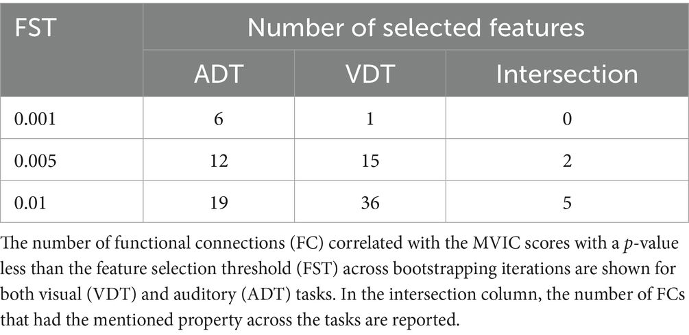 Depending on the task and FST, a slightly different set of features passed the bootstrapping threshold and were therefore selected to predict the test set MVIC score for each fold. We extracted the features that were consistently selected across all leave-one-out folds for each task–FST combination (Table 3). Both positive and negative features appeared in different folds of the analysis. However, for FSTs investigated here, no positively correlated features passed the bootstrapping threshold in all folds of the analysis, so the predictive models were predominantly determined by negatively correlated features. In addition, the intersection of the chosen features between the two tasks was examined to ascertain the predictive features that are not specific to either perception task (Table 3). The between-ROI FCs governing the MVIC prediction consistently across the two tasks are shown in Figures 5b,c, along with their corresponding functional networks.