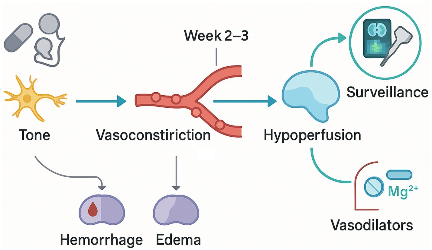 The biphasic complication profile—early cortical convexity subarachnoid hemorrhage and vasogenic edema followed by later ischemia—can be integrated within this framework. In the early phase, transient surges in pressure and flow in the setting of endothelial dysfunction and blood–brain barrier stress favor hemorrhagic and edema-dominant complications; as vasoconstriction intensifies and autoregulation remains impaired, the balance shifts toward flow-dependent tissue injury in watershed territories (Oliveira et al., 2022; Kaufmann et al., 2024; Garg et al., 2021). Overlap with posterior reversible encephalopathy syndrome in both triggers and imaging features reflects shared vascular dysregulation rather than distinct disease processes, reinforcing the concept that delayed infarction in reversible cerebral vasoconstriction syndrome is primarily the result of evolving tone-mediated hypoperfusion superimposed on a compromised microvascular interface. This mechanistic model substantiates surveillance during the second–third week after onset and supports perfusion-sensitive monitoring as a means to anticipate and mitigate delayed cerebral infarction.