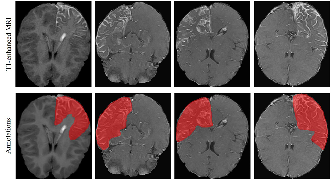Clinical manifestation of SWS is the presence of intracranial vascular anomaly, i.e., LA (Ramirez and Jülich, 2024). Currently, the identification of LA relies on visual inspection of the imaging data, particularly MRI, by experienced clinicians. However, the expertise of experienced doctors may not always be readily available, and manual labeling of lesions is time-consuming. Therefore, an automatic diagnosis tool is required for accurate and efficient diagnosis of SWS.