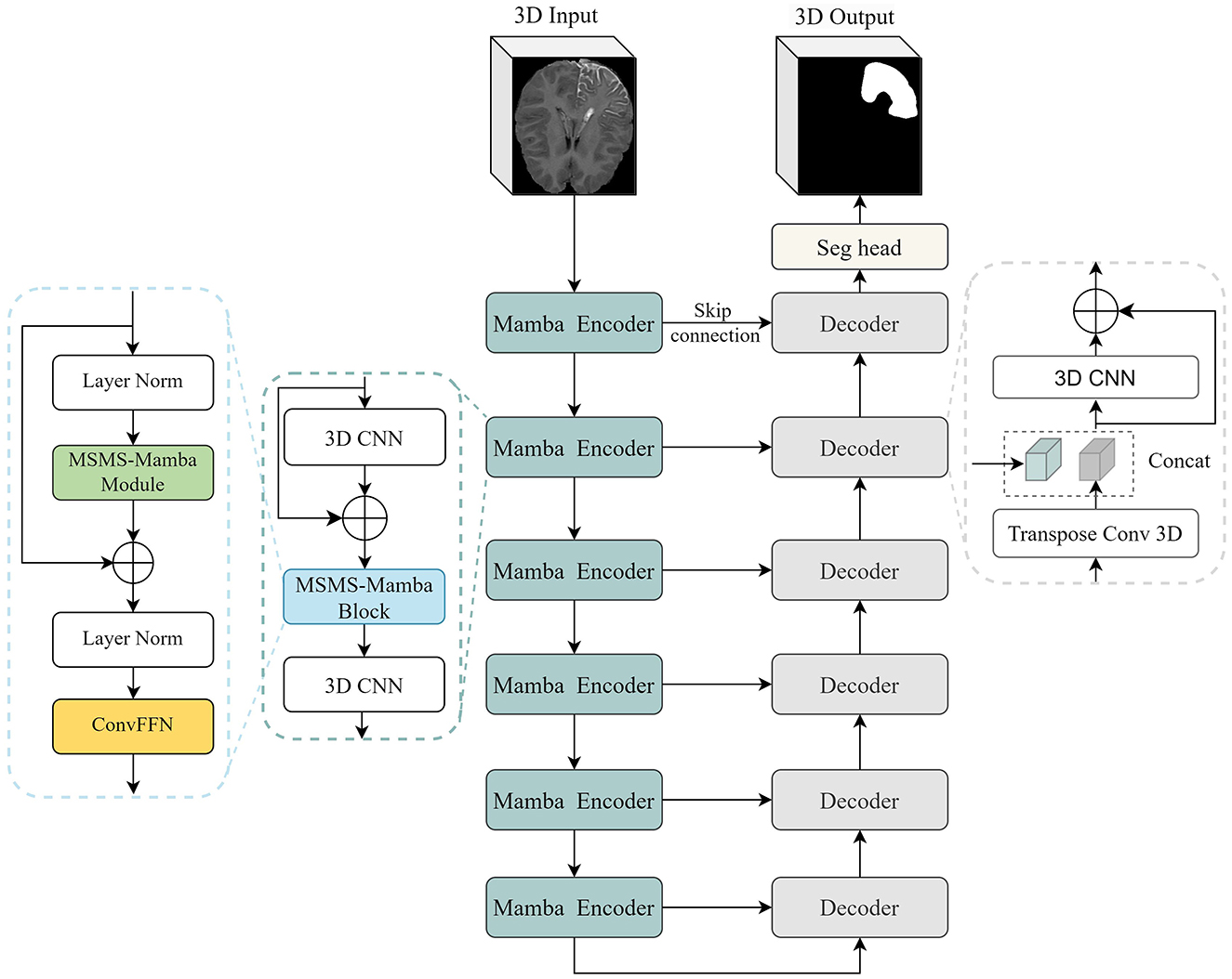 Different from traditional nnU-Net using CNNs in each encoding and decoding layer, Mamba is embedded in each encoding layer in the present study in order to capture long-range dependencies. Based on a selective SSM, Mamba has lower computational complexity as compared to conventional sequential modeling approaches such as RNN and Transformer (Gu and Dao, 2024). Besides, a novel MSMS strategy is proposed to convert the 3-D volumes into sequences as input of the SSM. The MSMS strategy integrates multi-resolution feature fusion with multi-scanning order, enabling robust global context modeling while maintaining linear complexity by explicitly decoupling spatial dependencies across reduced scales and different directions. This lies in the main novelty of the present study.