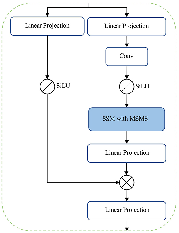 The main novelty and contribution of the present work lies in the integration of the MSMS-Mamba block in the encoder to enhance long-range dependency modeling and improve feature fusion. The scheme of the MSMS-Mamba block is shown in the left of Figure 2. It is composed of four consecutive components: an initial layer normalization, the MSMS-Mamba module for long-range dependency and multi-scale modeling, a second layer normalization, and a convolutional feed-forward network (Shi et al., 2024) for feature refinement. Among the four components, the MSMS-Mamba module is the key of the MSMS-Mamba block, whose scheme is shown in Figure 3. It is built based on a SSM model with dedicated MSMS strategy, as shown in Figure 4. Details of the SSM model and the MSMS strategy are introduced hereafter.
