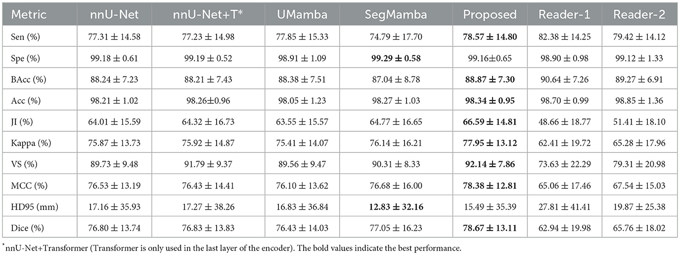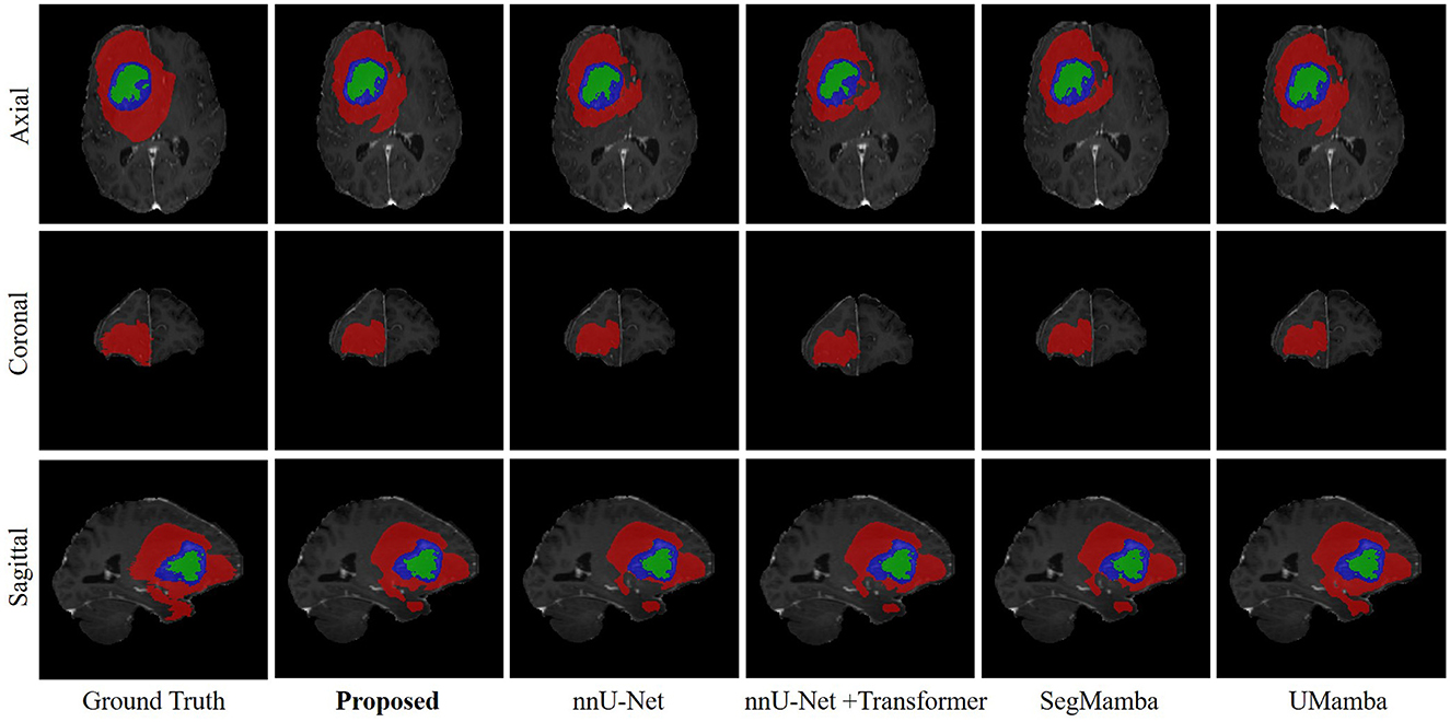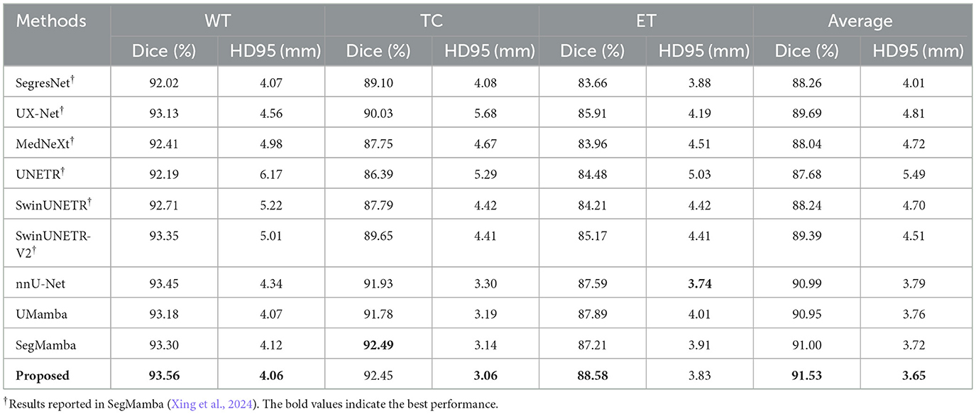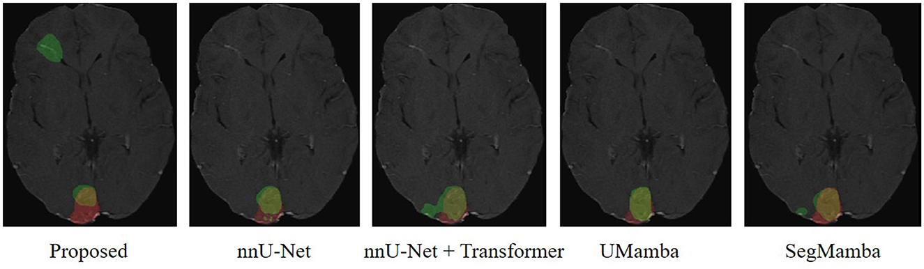 Figure 5 shows an example of the segmentation results of the WT, TC, and ET on the BraTS dataset, produced by our model as well as several SOTA methods such as nnU-Net (Isensee et al., 2021), UMamba (Ma et al., 2024), and SegMamba (Xing et al., 2024), which are re-implemented in the present study based on the open-source code. All methods seem to produce very good segmentation results. However, the quantitative metrics over the entire testing set, showing in Table 4, suggest that our model outperforming nnU-Net, UMamba, and SegMamba except for Dice in TC and HD95 in ET.