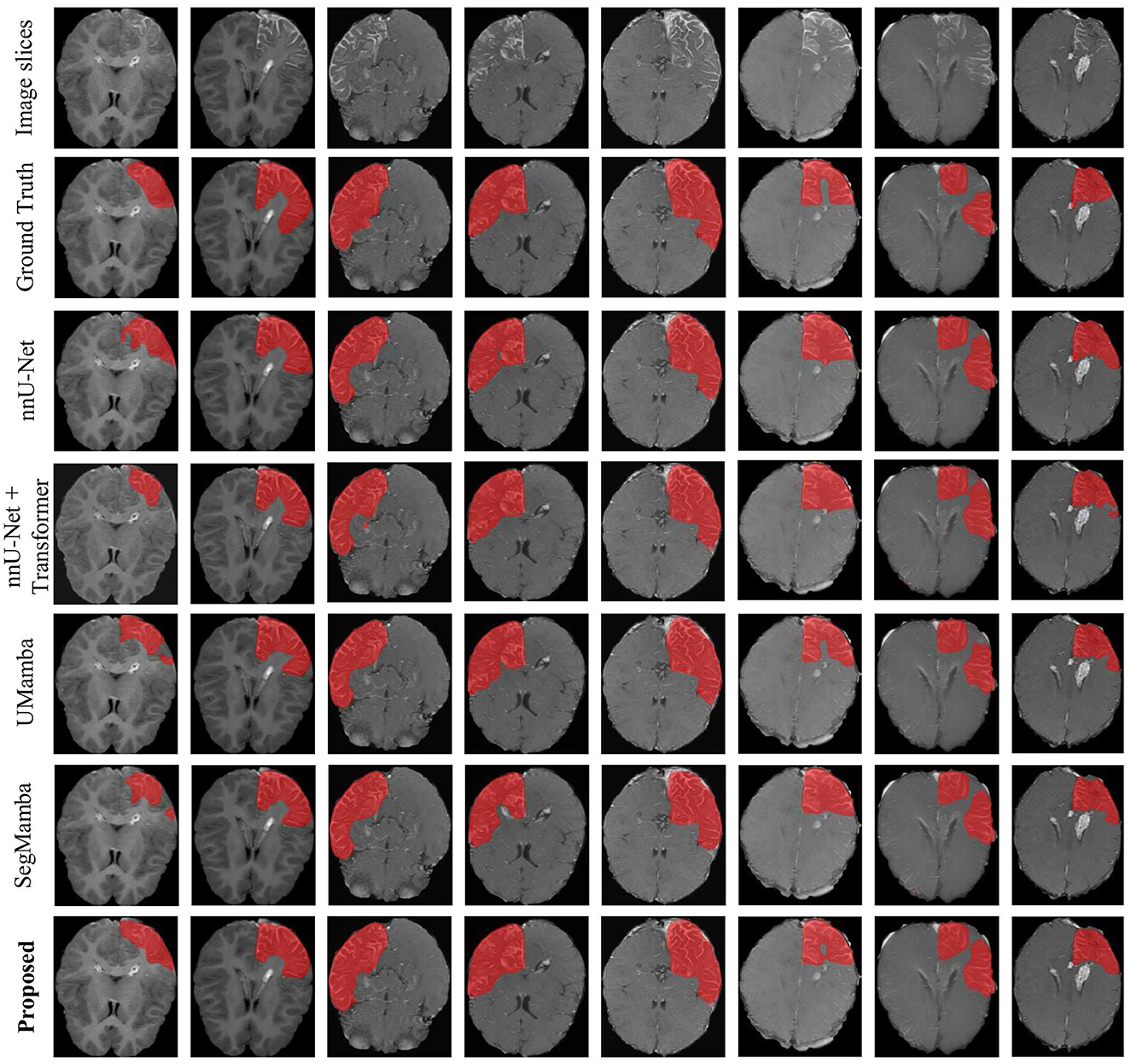 Furthermore, the original Mamba with pre-training on the BraTS dataset produces a Dice score of 76.43% on the SWS dataset, improving 1.31% compared to original Mamba only. Without pre-training, the combination of multi-scale and multi-scan strategies yields a Dice score of 77.18%. Finally, as reported in Table 6, the proposed method integrating multi-scale, multi-scan, and pre-training achieves the best performance, i.e, with a Dice score of 78.67%. These results demonstrate the effectiveness of the MSMS architecture and the pre-training strategy.