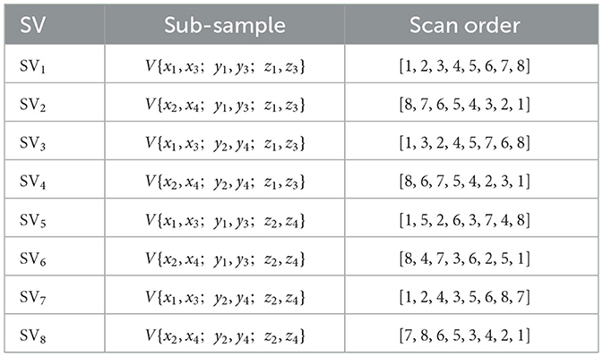 In the upper branch, sub-sampling is first employed to divide the input 3D volume V into several smaller sub-volumes (SVs) in order to alleviate long-range forgetting (Shi et al., 2024). To this end, the 3D volume V is uniformly partitioned into N segments along each axis, resulting in N3 basic elements: . In the present study, N = 4 thus 64 basic elements are obtained. Then 8 SVs can be derived, with each consisting of 8 basic elements sampled from the entire volume (two elements from each axis), as shown in Table 2. For instance, the SV1 in Table 2 is sampled from {x1, x3}, {y1, y3}, and {z1, z3}, denoted as