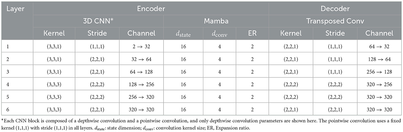 Detailed model parameters of the CNN and Mamba blocks are reported in Table 3. Note that each CNN block is composed of a depthwise convolution and a pointwise convolution, and only the parameters for depthwise convolution are shown here. The pointwise convolution employed a fixed kernel (1,1,1) with stride (1,1,1) in all layers. For the MSMS-Mamba blocks, the key parameters, i.e., state dimension, convolutional kernel size, and expansion ratio were set as default configuration in Mamba (Gu and Dao, 2024).