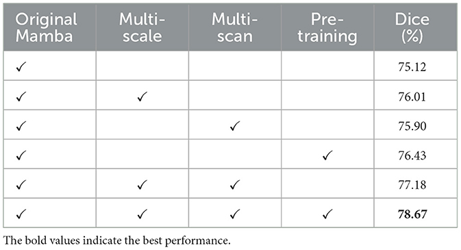 The ablation results shown in Table 6 demonstrate the effectiveness of the MSMS strategy. Besides, the entire model proposed in the present study outperforms several SOTA models, including nnUNet, UMamba, and SegMamba, in both brain tumor segmentation on the BraTS dataset and LA segmentation on the SWS dataset. Our framework significantly enhances Mamba's feature extraction capability for 3D medical images through multi-scale and multi-scan hierarchical integration, which systematically aggregates discriminative features across varying receptive fields. However, note that the reproduced results for SegMamba on the BraTS dataset (Table 4) are slightly lower than that originally reported in Xing et al. (2024), which may be due to possible difference in the implementation hardware between the present study and Xing et al. (2024).