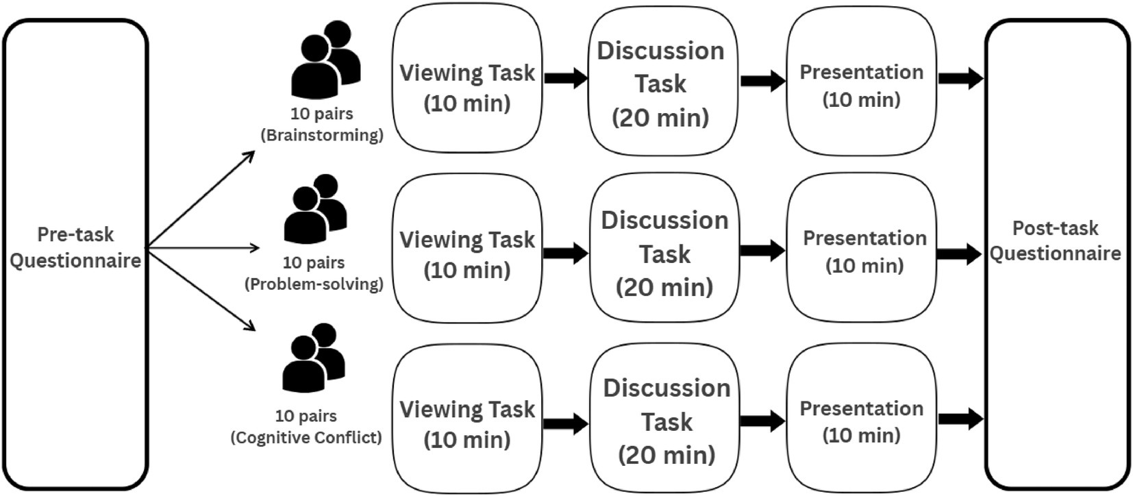 Figure 1. Experimental design illustrating the sequence of phases (viewing, discussion, presentation) and task-type allocation across participant dyads.