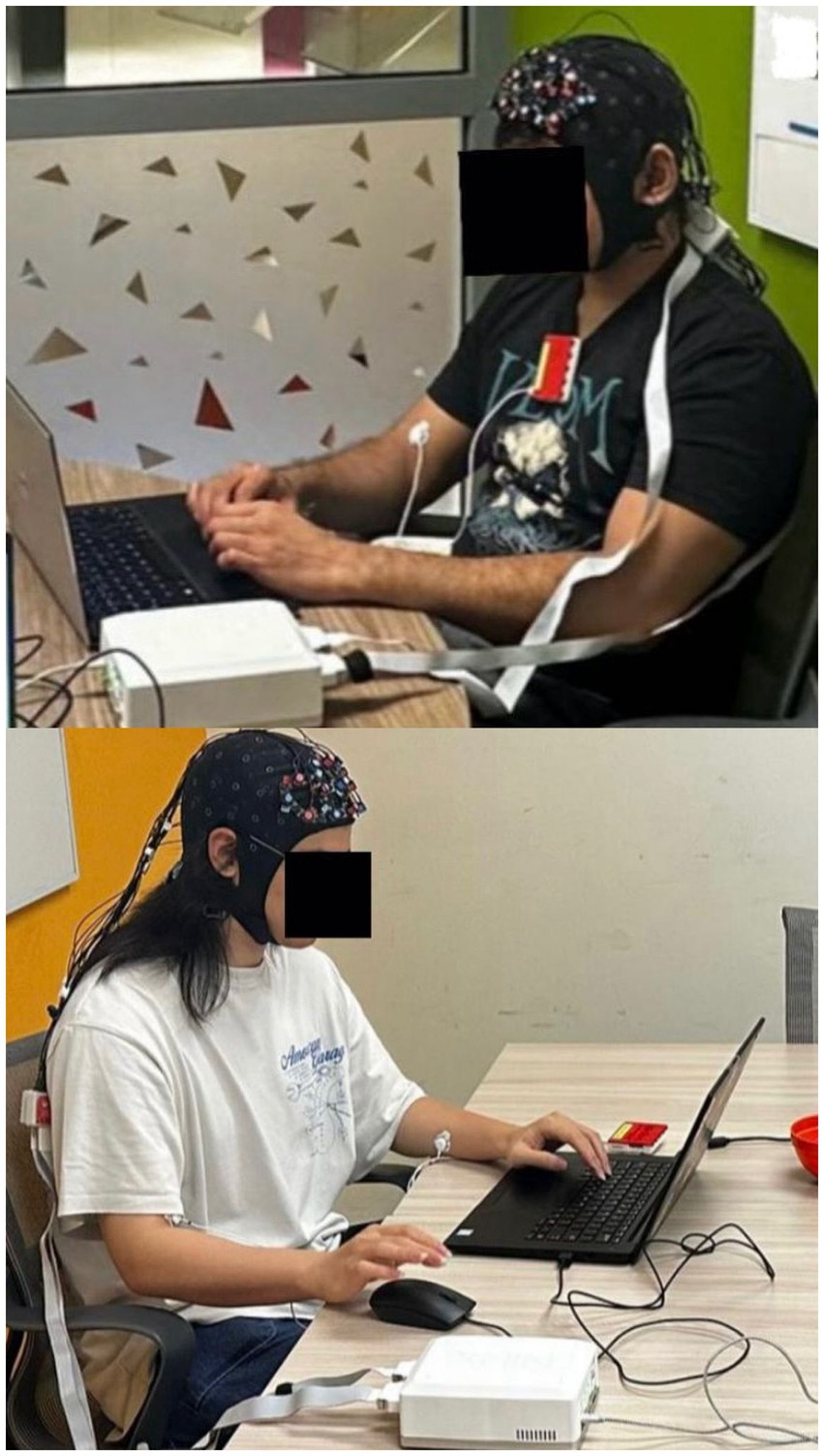 Figure 2. Experimental setup: participants seated in different rooms, connected via Zoom, each wearing an fNIRS device.