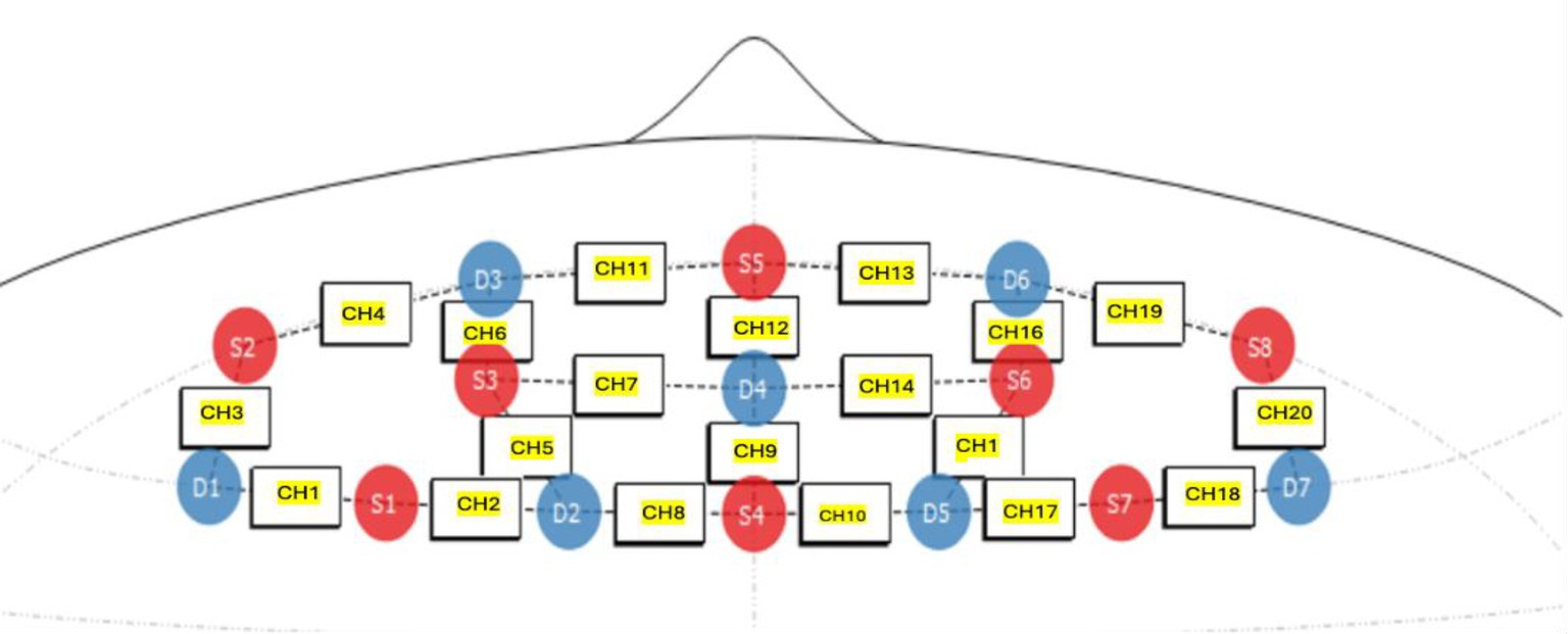 The measurement of changes in oxygenated (HbO) and deoxygenated (HHb) hemoglobin in the prefrontal cortex was conducted using a NIRSport2 (NIRx Medical Technology LLC) continuous-wave fNIRS device. A multi-channel portable system (8 sources and 8 detectors, NIRSport 64 data channels) was used for data recording (see Figure 3). The customized prefrontal cortex source-detector arrangement was determined by the manufacturer. Eight sources and seven detectors were positioned in reference to Cz and the nasion, resulting in a total of 20 channels. The source optodes transmitted light at 760 and 850 nm, and data were sampled at a frequency of 10 Hz. Optode placement followed the international 10–20 system, targeting the prefrontal cortex. All fNIRS data were streamed wirelessly to a local computer using Aurora (version 1.4) software and saved in the Shared Near Infrared Spectroscopy Format (SNIRF; Tucker et al., 2022).