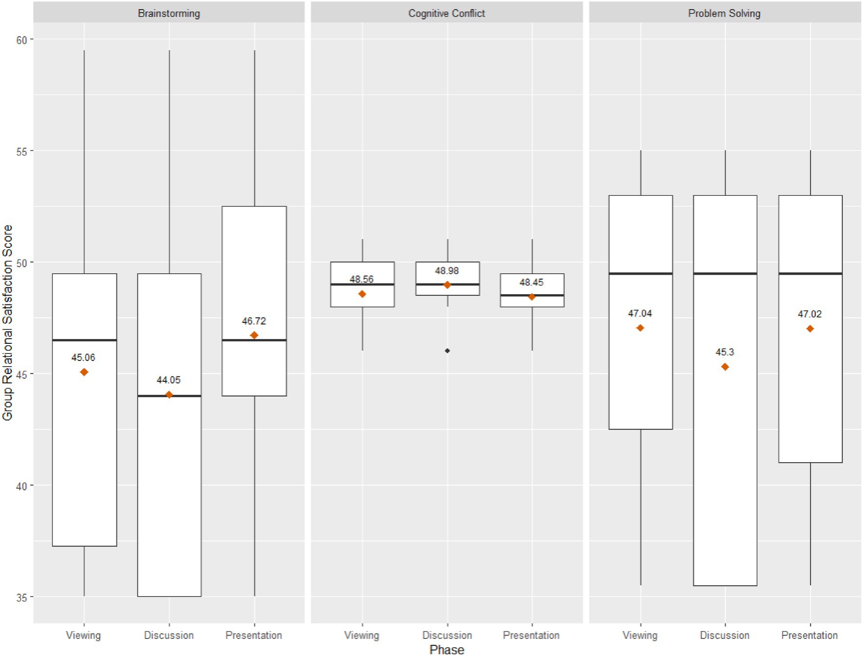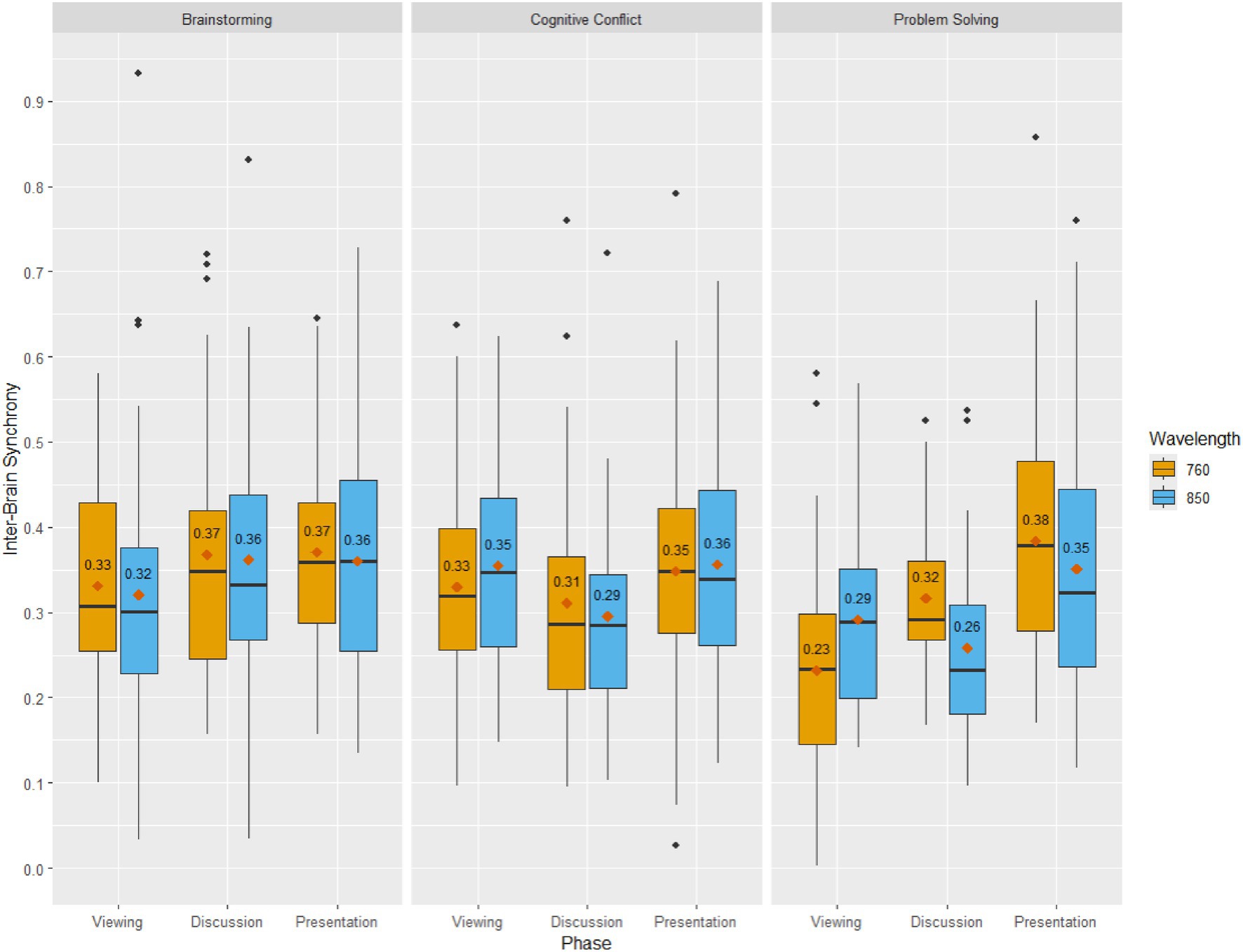 Table 1 presents the descriptive statistics of Inter-Brain Synchrony (i.e., maximum correlation value) and Group Relational Satisfaction scores for the present sample. Figure 4 illustrates inter-brain synchrony by task, condition, and wavelength and Figure 5 depicts boxplots of group relational satisfaction scores by task and condition.