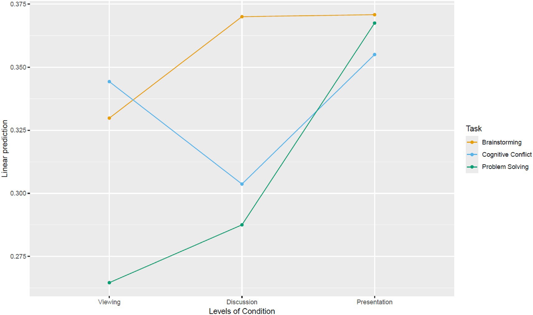 There was also a significant interaction (see Figure 6) between phase and task on IBS, F(4, 957) = 6.114, p < 0.001, = 0.025. Post-hoc examination of simple effects highlighted that: (a) For brainstorming, IBS during presentation was only significantly higher than viewing (Δ = 0.041, p = 0.032); (b) for cognitive conflict, IBS during presentation was only significantly higher than discussion (Δ = 0.051, p = 0.019); and (c) for problem-solving, IBS during presentation was significantly higher than both viewing (Δ = 0.103, p < 0.001) and discussion (Δ = 0.080, p < 0.001).