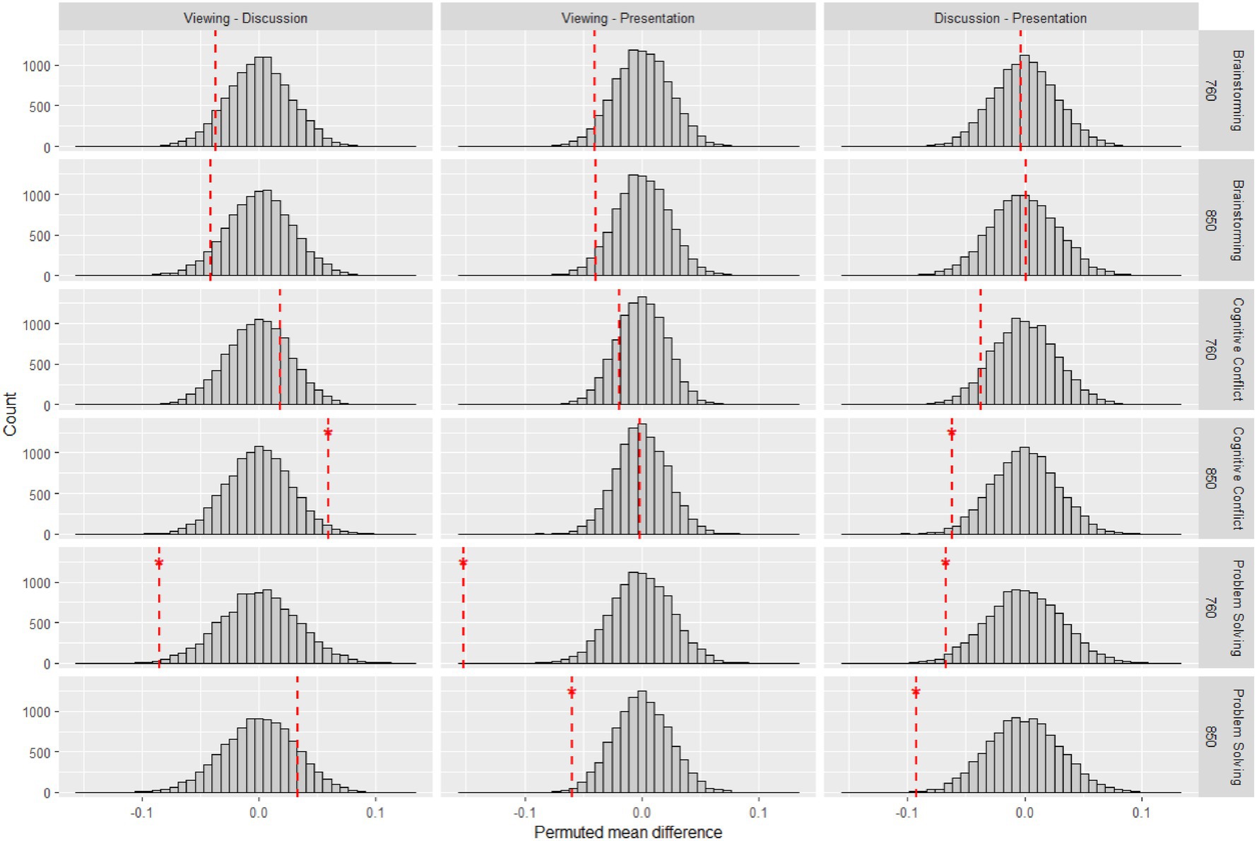 Figure 8. Permuted pairwise contrasts of IBS between phases across tasks and wavelengths. Red dashed lines indicate observed values. *p < 0.05.