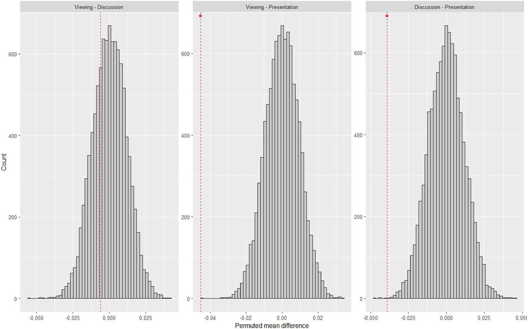 Figure 7. Permuted pairwise contrasts of IBS between phases. Red dashed lines indicate observed values. *p < 0.05.