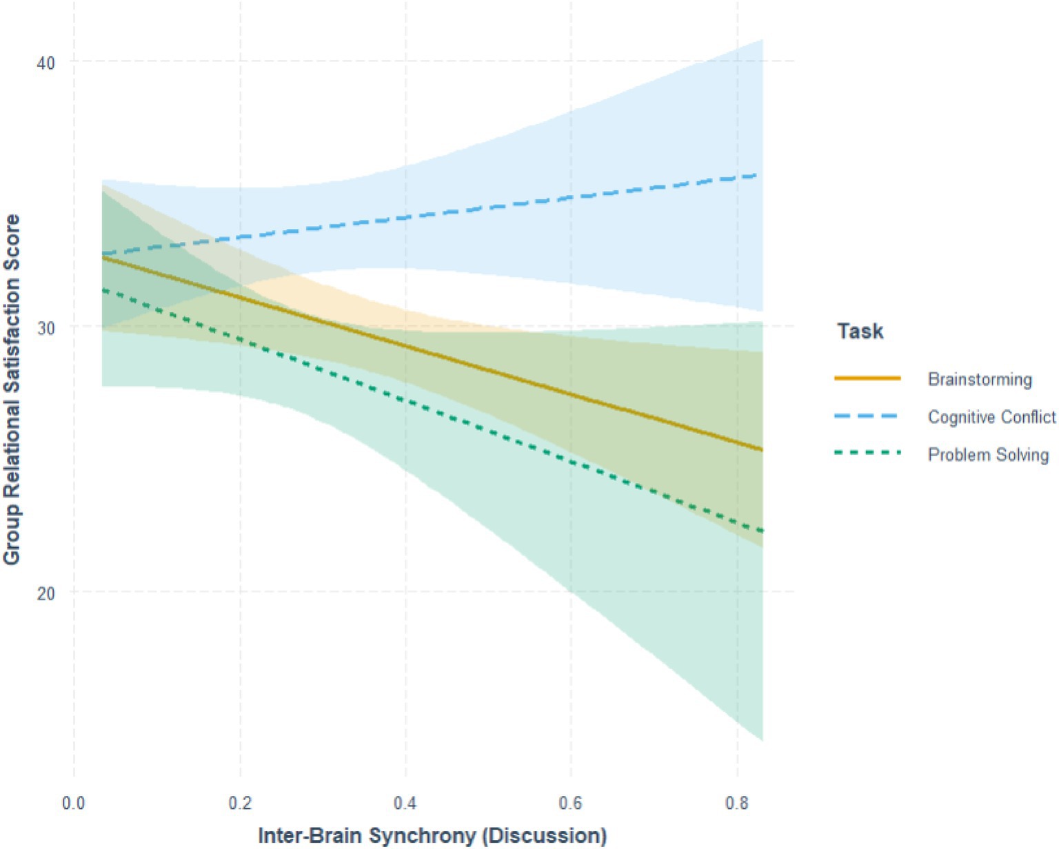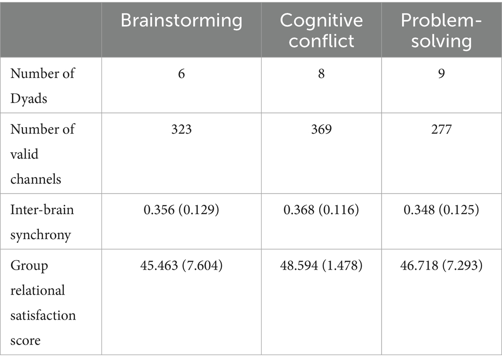 Beyond phase-related differences, post-hoc analyses revealed distinct synchrony patterns across the three collaborative tasks. A significant increase in IBS was observed during Brainstorming compared to Problem Solving, with a similar but descriptive upward trend relative to Cognitive Conflict. The free-flowing exchange of brainstorming may transiently heighten alignment through shared attention and perspective-taking. This is consistent with unstructured, co-creative dialog that encourages spontaneous idea of exchange and mutual responsiveness (Straus, 1999). Participants are free to build on one another’s ideas in an open and collaborative manner. This fluid exchange likely promotes continuous mutual attention, spontaneous turn-taking, and verbal mirroring, processes that enhance neural coupling. In contrast, cognitive conflict and problem-solving tasks, which demand more structured, goal-oriented, and evaluative forms of interaction (Straus, 1999), exhibited lower synchrony during discussion but a sharper rise during the presentation phase. This reflects a delayed alignment that emerges when consensus must be enacted rather than negotiated. The structured and evaluative nature of cognitive conflict may transiently disrupt coupling as partners oscillate between agreement and disagreement while reconciling differing viewpoints (Hirsch et al., 2021). Similarly, our problem-solving activity emphasized evaluating options and reasoning independently fosters parallel rather than co-constructed processing. Such goal-directed divergence reduces the shared attentional focus that undergirds neural coupling (Fishburn et al., 2018).