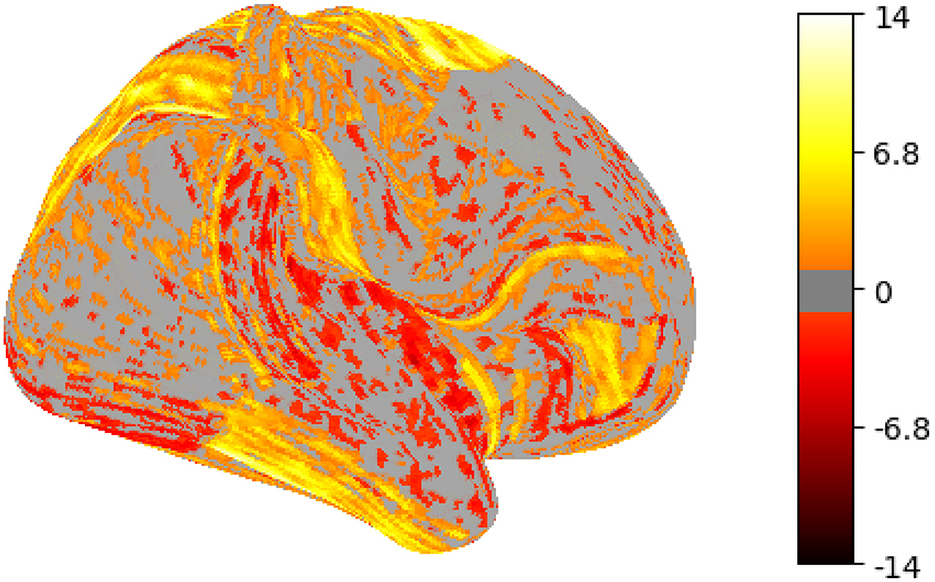 To evaluate the effectiveness of individual temporal feature sets, an ablation study was conducted, wherein the prediction performance of different feature extraction methods, mentioned in Section 4.2.2, was compared. The results of this ablation study, indicated CATCH22, SUMMARY, and the proposed HISTOGRAM-based features to be the top-performing features among all. So, for each of these three, further features were extracted from three different representations of the signal, viz. the raw, first-order difference, and second-order difference, resulting in a total of nine temporal feature variants. Subsequently, each of these nine feature sets was subjected to a range of regression algorithms used earlier, the results of which are summarized in the ablation study. As can be observed therein, SVR consistently outperformed other regressors for four out of the six existing temporal feature sets. However, the first- and second-order variants of the CATCH22 feature set exhibited better performance when modeled using LASSO Regression. Based on this analysis, SVR and LASSO were selected as the primary regressors for their respective feature sets. For the raw histogram, first-order histogram, and second-order histogram features, CNN1 consistently performed better compared to other CNN architectures, and hence was used in all the further regression analysis. To construct an optimal, grayordinate-wise temporal representation, different performance metrics, such as MSE, MAE, r2 score, and correlation, were computed for each of the nine feature sets at every grayordinate. The feature set yielding the best metric for a given grayordinate was selected as the optimal representation for that location. This procedure was repeated across all 59, 412 grayordinates. The corresponding performance metrics obtained from this optimal combination approach are presented in the ablation study. The results indicate that the optimally selected feature configuration leads to improved prediction performance across all contrasts, with MSE serving as the most reliable metric for determining grayordinate-wise feature set assignment. A summary of these results, with the optimal MSE-driven feature-regressor selection, is provided in Table 2.