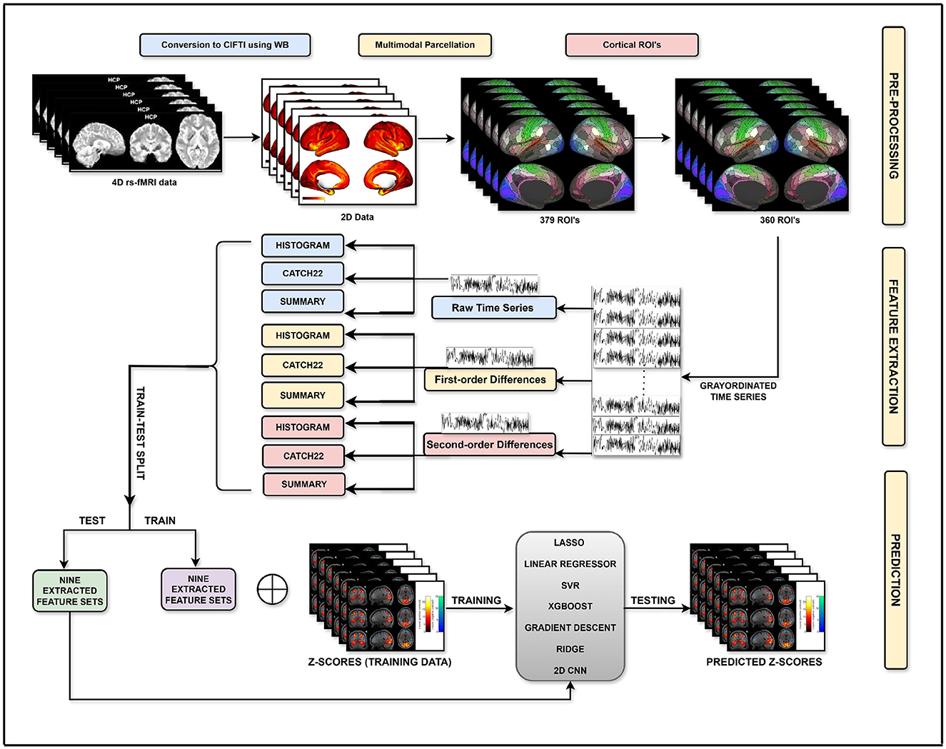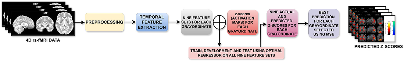As discussed above, the proposed task-activation map prediction approach formulates the prediction task as 59, 412 univariate time series regression problems, where the prediction of a z-score at each of the 59, 412 grayordinates is obtained through its own tailored regression model trained using the corresponding 1, 200-length rs-fMRI time series. To train the time series regression models, the entire rs-fMRI data of 336 subjects was first divided into a training and a testing set in an 80:20 ratio, thus resulting in a training set of 268 samples for each grayordinate's prediction model. Following this, different time series feature extraction methods, as discussed in Section 2.3, were applied, generating a corresponding feature set for its z-score prediction. To further capture the temporal dynamics of the fMRI signal, the features were also computed from two additional representations of the rs-fMRI time series, i.e., first-order and second-order differences of the raw time series. These derivatives emphasize signal changes and accelerations or curvature, respectively, potentially unveiling transient or subtle temporal patterns not easily recognizable in the raw data.