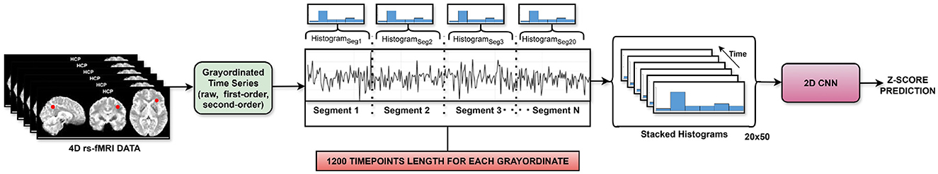 However, since rs-fMRI signals can only be approximated as locally stationary, it is necessary to analyze them over shorter temporal windows, where the statistical characteristics of the signal, modeled by the histogram, can be assumed to remain unchanged, So, unlike the existing statistical summary features, which are essentially computed over the entire signal, the proposed histogram features were computed from smaller non-overlapping windows, over which the signal can be assumed to be stationary. As suggested by the prior work in the fMRI data analysis (Leonardi and Van De Ville, 2015; Preti et al., 2017), the assumption of stationarity, for the rs-fMRI signal, typically holds within windows of approximately 30–60 seconds [corresponding to 40–80 TRs (Repetition Time) in the HCP dataset, with TR = 0.72 s]. Motivated by this, each rs-fMRI time series of 1,200 timepoints, corresponding to a total duration ≈ 864 s, was first segmented into N non-overlapping segments. In this study, N was set to be 20, resulting in 60 timepoints per segment (≈43.2 s), thus respecting the assumption of stationarity. The proposed segmentation-based approach ensured that temporally local characteristics of the rs-fMRI are preserved, while still capturing the evolving signal dynamics. Following the segmentation, for each segment, a histogram with 50 bins was computed, yielding a segment-wise histogram of size 20 × 50 per subject, which essentially summarized the local distributional properties of the rs-fMRI signal while retaining temporal variability across segments. A similar exercise was repeated for the first-order and second-order differences of the raw time series. Overall, the proposed approach is analogous to computing time-varying summary statistics but with substantially greater descriptive power.