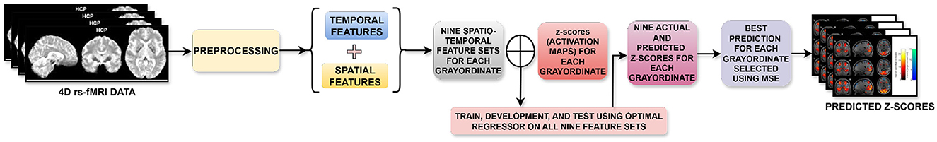 With this motivation, to overcome the limitations of the existing methods, a novel task-activation map prediction approach is presented here, which uniquely exploits the rich temporal information of the rs-fMRI data and also combines it with the spatial connectivity information. Specifically, the task-activation map prediction is first formulated as a time-series regression task wherein the rs-fMRI time series at each grayordinate is modeled as a predictor while the corresponding z-score is the target variable. To perform the regression task, apart from exploring the existing time series regressors, a novel histogram-based regression method is proposed, which exploits a unique set of features derived from diverse representations of the rs-fMRI. The predictions are improved further by developing a novel grayordinate ensemble modelling for regression (GEMReg), which integrates the optimal temporal features for each grayordinate, with the spatial features obtained using functional connectivity, resulting in 59412 distinct prediction models, individually optimized for each grayordinate. The main contributions of this work can be summarized as follows.