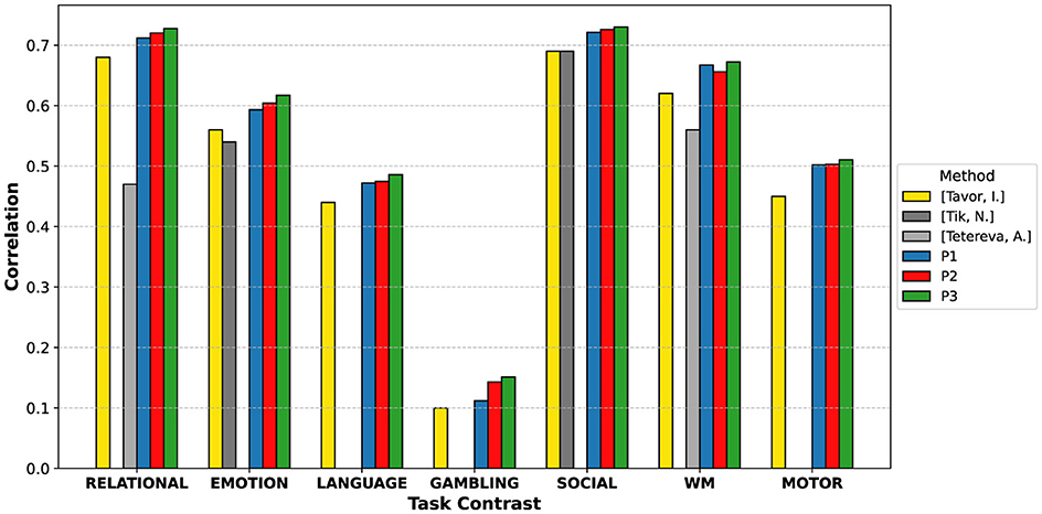 Figure 6. Comparison of task activation map prediction performance across methods and task contrasts (Tavor et al., 2016; Tik et al., 2023; Tetereva et al., 2022). P1, P2, and P3 represent the proposed histogram-based, optimal temporal feature-based, and optimal spatio-temporal feature-based models, respectively. The missing bars in comparisons indicate the unavailability of those results.
