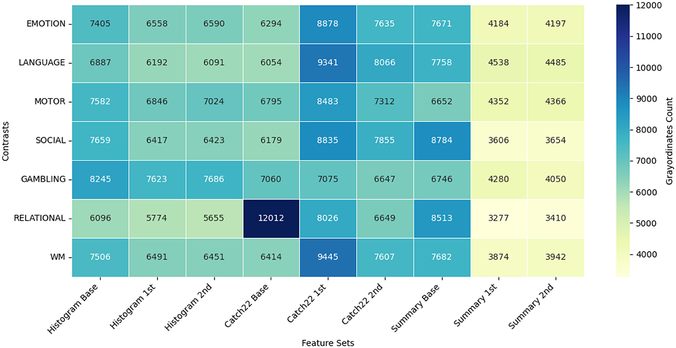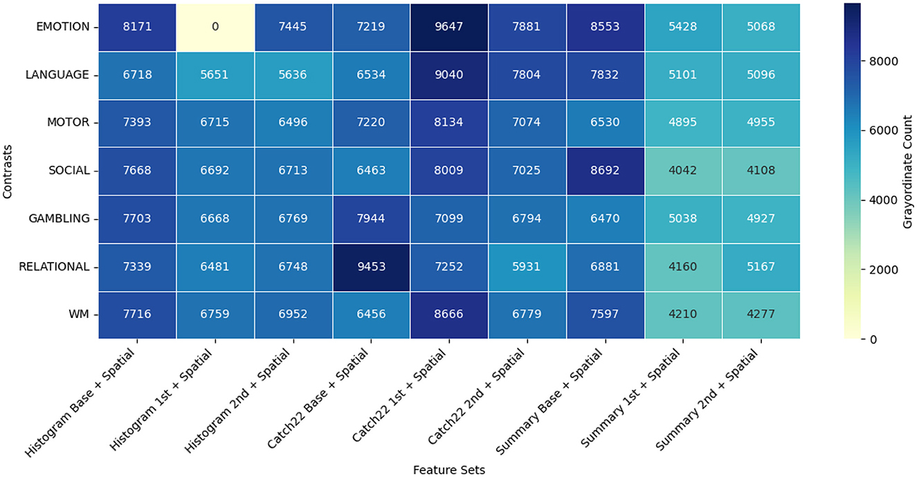 To understand and explain the advantage of exploiting the different feature sets through the proposed GEMReg framework, here we studied feature distribution for grayordinate-wise prediction across seven contrasts using a diverse set of temporal and spatio-temporal features. The temporal feature sets included Histogram-based, CATCH22, and Summary statistics, each further divided into base, first-order, and second-order variants. In parallel, their spatio-temporal counterparts were also included in the analysis. As explained earlier in 3.3, for each of the 59,412 cortical grayordinates, the best-performing feature set was selected based on MSE. Figures 7, 8 depict the resulting frequency heatmap of feature distribution for temporal and spatio-temporal features, respectively.