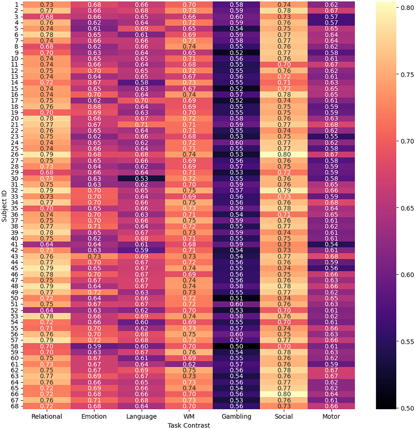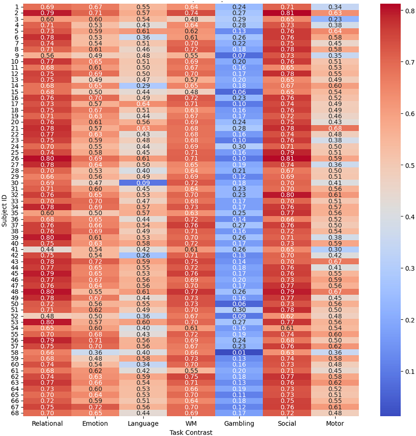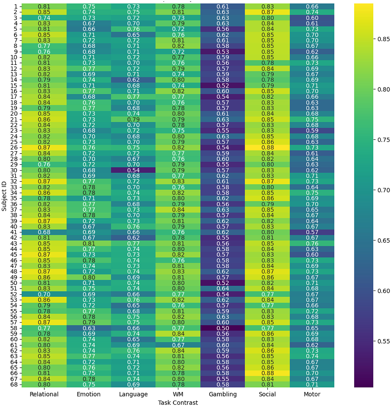 To evaluate and compare the accuracy of the proposed spatio-temporal GEMReg across individual subjects, it's a subject-wise performance analyses using different metrics are provided in Figures 9–11. In Particular, Figure 9 presents a heatmap of Pearson correlation coefficients between predicted and actual activation maps across 68 subjects and seven task contrasts. The results reveal consistently good performance across subjects for RELATIONAL, SOCIAL, and WORKING MEMORY tasks, with many individuals showing correlations above 0.7. In contrast, the GAMBLING task exhibits lower correlations, suggesting greater inter-subject variability or task complexity. Similarly, Figure 10 presents the AUC scores across 68 subjects and seven task contrasts, illustrating the classification performance at an individual level. The model consistently achieves high AUC values above 0.80 across the RELATIONAL, SOCIAL, and WORKING MEMORY tasks, indicating strong discriminative ability for most subjects. In contrast, the GAMBLING task generally yields lower AUC scores, reflecting greater task complexity or variability. Finally, Figure 11 displays the Dice coefficients for each of the 68 subjects across the seven task contrasts, highlighting the overlap between predicted and actual activation regions. Again, the model achieves consistently high Dice scores, typically above 0.70, for RELATIONAL, SOCIAL, and WORKING MEMORY tasks, indicating strong spatial agreement. As seen in prior metrics, the GAMBLING task remains more challenging, with comparatively lower overlap scores. Overall, the analysis highlights the model's robust generalization across subjects, while also reflecting contrast-specific differences in prediction accuracy.