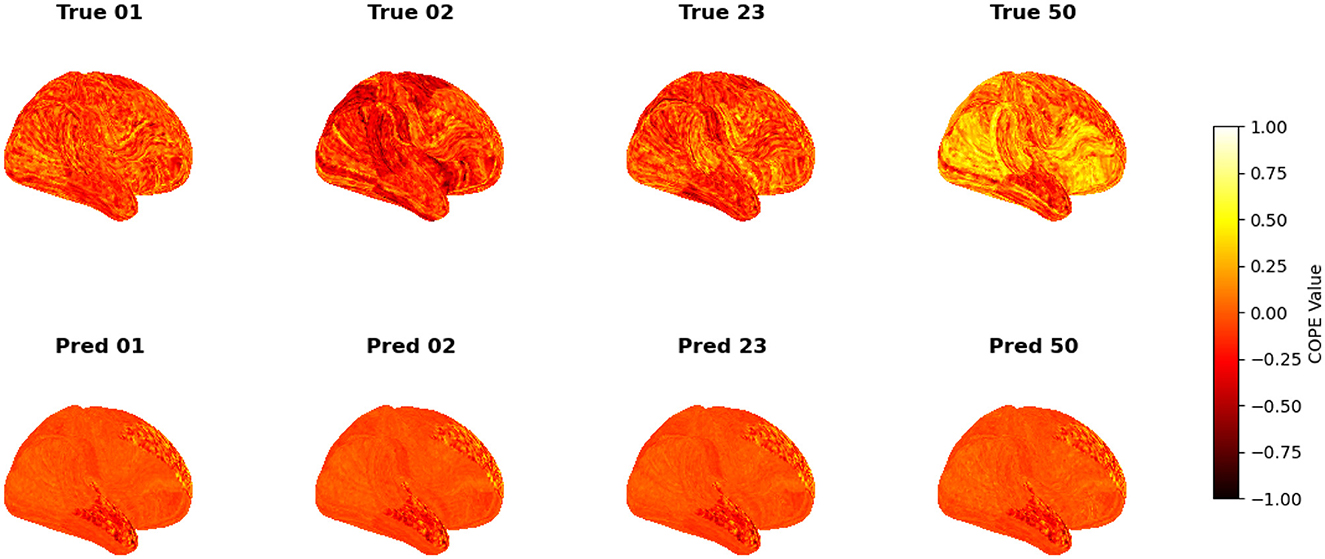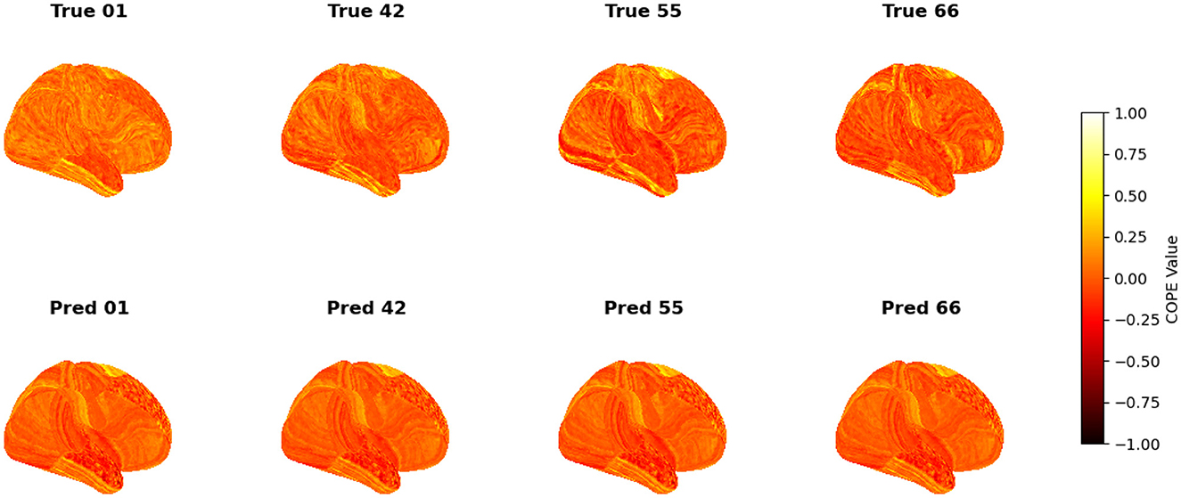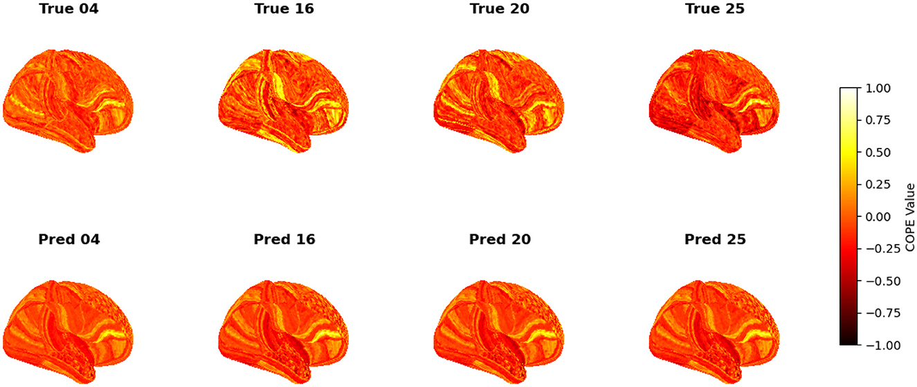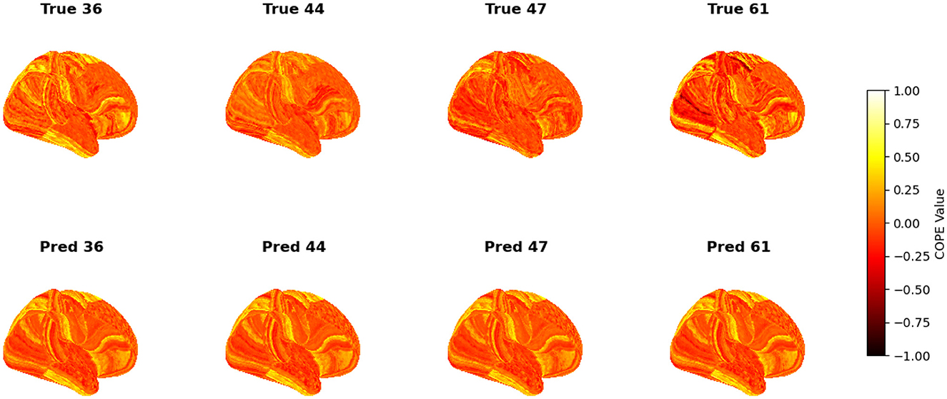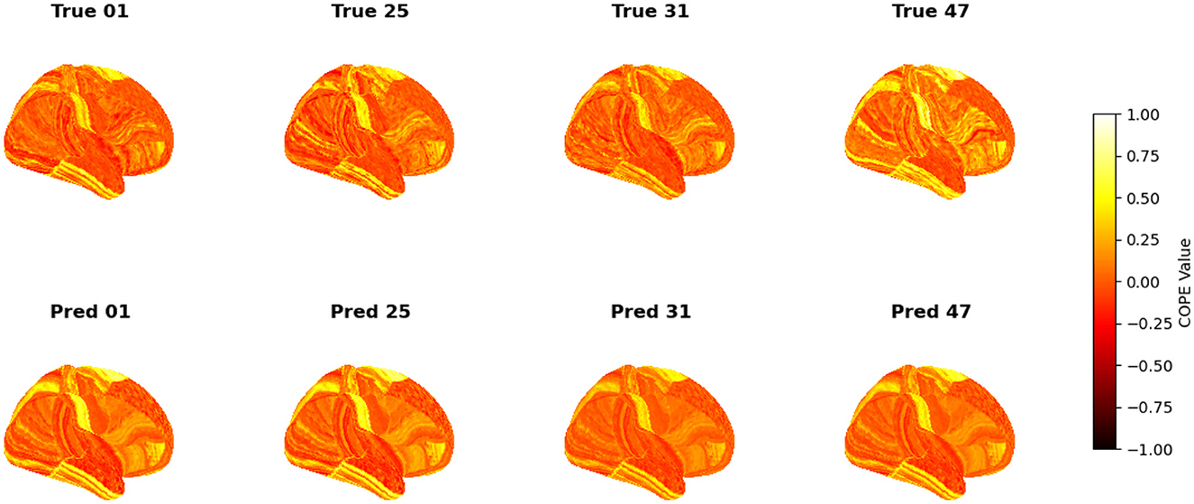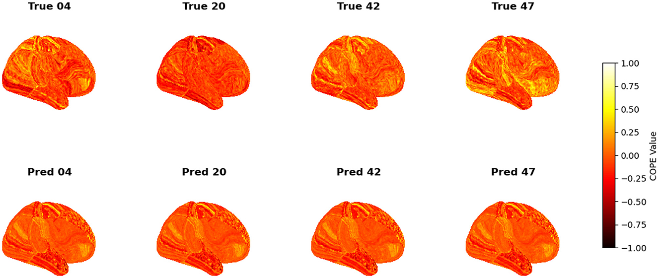 To visualize the subject-level performance of predicted brain activations, a surface-based visualization pipeline was implemented that compares actual and predicted activation maps projected onto the cortical surface. Such subject-specific visual comparisons are critical for identifying localized regions of strength or weakness in prediction and serve as an important complement to quantitative evaluation metrics such as Pearson correlation, MAE, and MSE. Moreover, the visual correspondence between predicted and true maps offers insights into lateralization effects and the degree to which the model captures meaningful functional topography. Using the nilearn.plotting.plot_surf_stat_map function, statistical activation values were mapped onto the inflated cortical surfaces for the right hemisphere, although a similar visualization can be obtained for the left hemisphere. The cortical geometry was defined using fs_LR 32k resolution surface mesh files for each hemisphere. For each subject, true and predicted activation maps were plotted one below the other, allowing a direct visual assessment of spatial similarity. Figures 12–18 show the representative results for a few subjects for RELATIONAL, EMOTION, LANGUAGE, GAMBLING, WORKING MEMORY, SOCIAL, and MOTOR contrasts, respectively. The strong spatial correspondence observed between the predicted and actual maps across subjects in Figure 12 demonstrates the model's ability to accurately capture subject-specific functional activation patterns in the context of the RELATIONAL task. Although EMOTION contrast results in Figure 13 reveal relatively greater discrepancies between predicted and actual activations compared to the RELATIONAL contrasts, the predicted maps still capture essential spatial features of the underlying activation patterns. Notably, common activation regions are preserved in the predictions, albeit with slightly reduced intensity, indicating that the model maintains spatial specificity despite the increased variability and complexity inherent to emotional processing. The predicted activation maps for the LANGUAGE task shown in Figure 14 exhibit substantial overlap with the ground truth, particularly within language-related cortical regions. Although slight discrepancies in activation intensity are present, the model effectively preserves the spatial organization and hemispheric lateralization typically associated with language processing. Compared to other task contrasts, the predicted activation maps for the GAMBLING task, depicted in Figure 15, exhibit relatively lower intensity and reduced spatial variability, indicating a more conservative model response in capturing task-specific patterns. Nevertheless, the predicted maps still preserve the broader spatial organization of the actual activations, particularly within ventromedial and orbitofrontal regions commonly associated with reward processing. For the working memory task, the predicted activation maps included in Figure 16 show strong spatial concordance with the ground truth, particularly in the dorsolateral prefrontal and parietal regions–areas characteristically involved in working memory processes. This consistency across subjects underscores the model's ability to reliably reconstruct activation patterns associated with higher-order executive functions, despite the distributed and complex architecture of the WORKING MEMORY network. Similarly, the predicted activation maps for the Social task in Figure 17 demonstrate a high degree of spatial correspondence with the ground truth, particularly in temporoparietal and medial prefrontal regions commonly associated with social cognition. The model effectively captures the distributed activation patterns elicited by the SOCIAL task, reinforcing its ability to generalize across subjects and task-specific cognitive domains. Finally, the prediction results in Figure 18 for the MOTOR task reveal the strong spatial agreement with the ground truth, particularly within primary motor and somatosensory regions. These results highlight the model's capacity to capture robust and localized patterns of motor-related brain activity, consistent with the known functional architecture of the MOTOR task. The overall findings presented above further demonstrate the proposed GEMReg's ability to generalize across diverse cognitive tasks, though with varying levels of predictive fidelity influenced by task complexity and inter-subject variability.