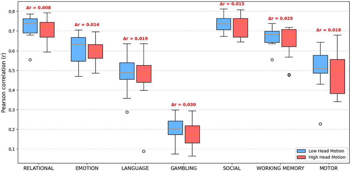 Figure 19. Boxplots of predictive performance (Pearson r) for low and high head motion subjects across seven task contrasts. Δr represents the mean correlation difference between groups.