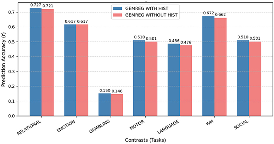 To assess the contribution of the proposed histogram-based time-series features to the overall GEMReg performance, we conducted an ablation study by comparing model performance with and without these features. As shown in Figure 20, the removal of the histogram-based features led to a consistent reduction in prediction accuracy across all task contrasts. The most pronounced effect was observed for the MOTOR, LANGUAGE, SOCIAL, and WORKING MEMORY tasks, suggesting that the histogram-based features effectively capture fine-grained temporal characteristics, particularly beneficial for these cognitive domains. This further underscores the importance of the proposed histogram-based features in improving the predictive performance of the GEMReg framework, as already suggested by the results in Figure 8.