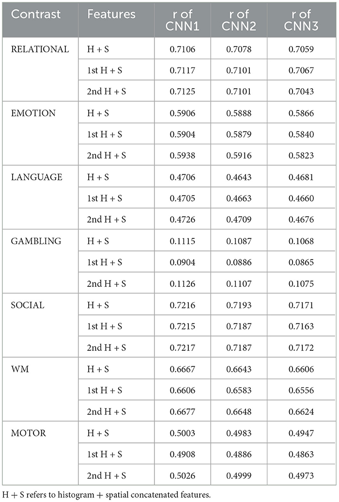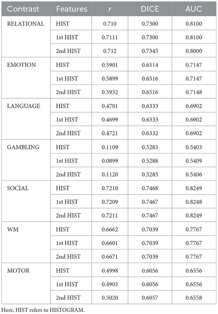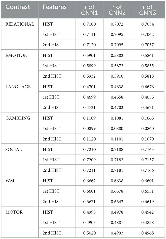 This subsection presents the detailed performance analysis of the proposed task-activation map prediction models using three different feature configurations: (i) proposed histogram-based features, (ii) optimally selected temporal features, and (iii) optimally selected spatio-temporal features. Starting with the histogram-based features, CNN1 was employed to predict the z-scores across all task contrasts using this feature type. The resulting performance metrics for each contrast, described in Section 2.2, are reported in Table 1. In addition to CNN1, other CNN architectures were also tried, the performance of which is detailed in the ablation study in Section 4.2.1.