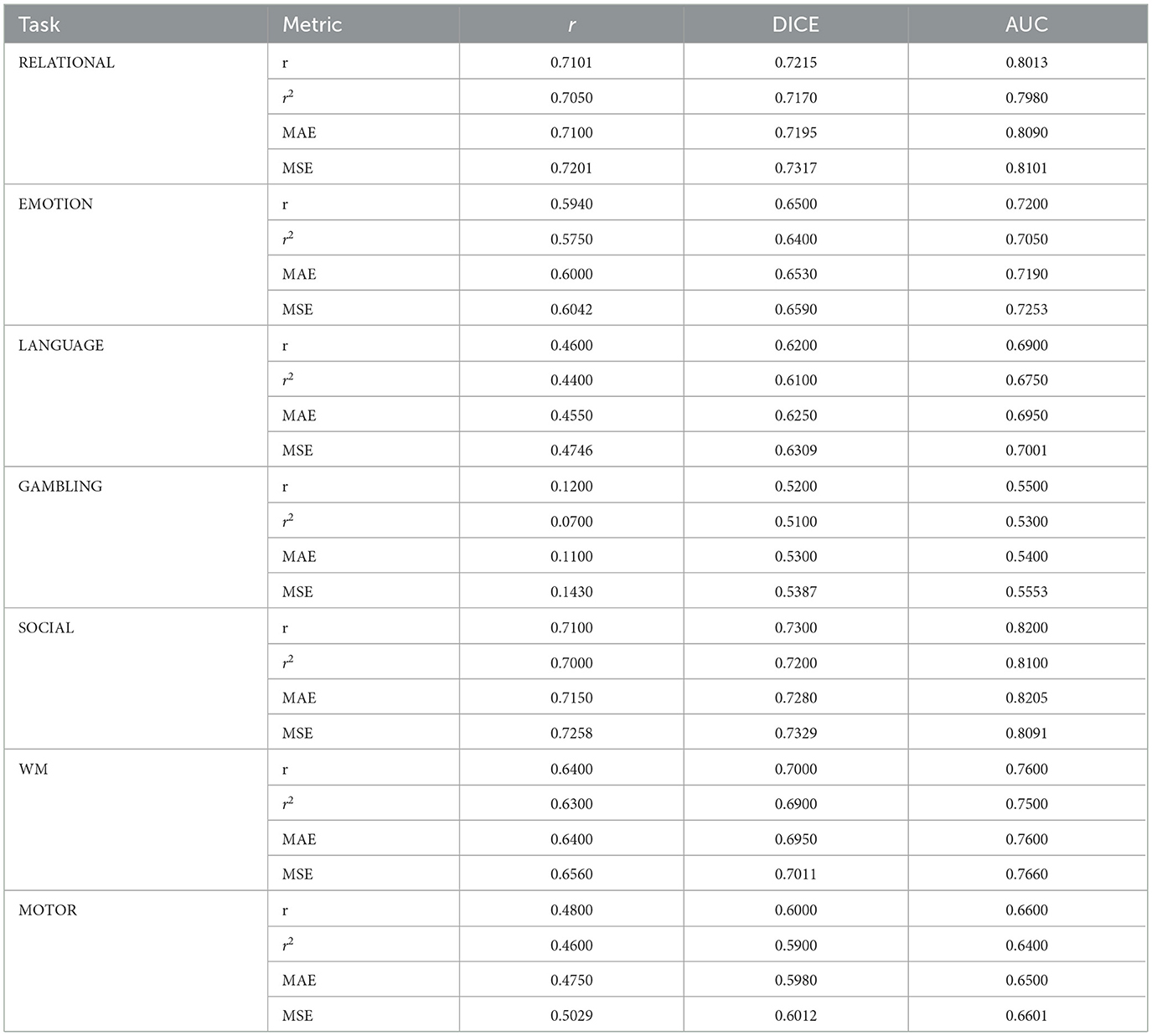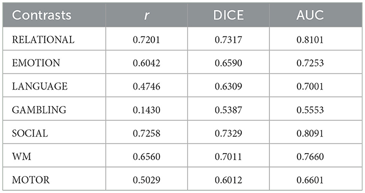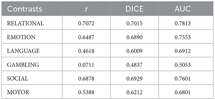 Table 3. Performance metrics for optimally selected spatio-temporal features across all task contrasts.