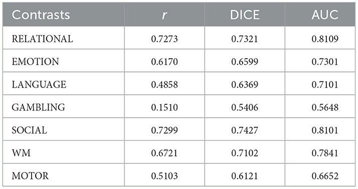This section provides a detailed performance analysis of the task activation map prediction models proposed hitherto, followed by a comparison with the existing prediction methods. Subsequently, a thorough ablation study, conducted to find the optimal feature sets and regressors, and hence the optimal prediction models, is also presented. All the experiments herein were performed on rs-fMRI of 336 subjects from the HCP dataset, as detailed in Section 3.1. 80% of the total data was used for training the models, while the remaining 20% was used for development and testing purposes. The average performance of the prediction models over the test data was quantified using several metrics, including the Pearson correlation coefficient (r), coefficient of determination (r2), mean absolute error (MAE), the mean squared error (MSE), the area under the ROC curve (AUC) and the DICE coefficient, In our work, although the task is formulated as regression, we additionally report Dice and AUC scores in line with prior literature. Since both Dice and AUC require binary class labels, median thresholding is applied to the continuous values of both predicted and actual maps. This converts each column into a binary partition (above-median vs. below-median) (Tavor et al., 2016), with approximately equal numbers of positive and negative cases. Such thresholding is commonly used in neuroimaging studies to evaluate spatial overlap and discriminative ability, making our results directly comparable with existing work that reports Dice and AUC for activation maps, as defined below: