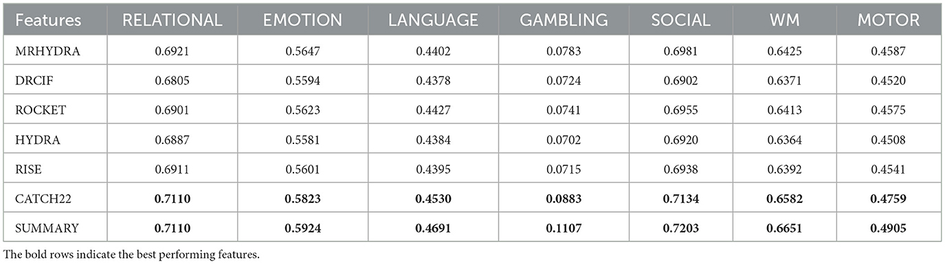 As described in Section 2.3, we evaluated several state-of-the-art time series feature extraction methods to identify effective temporal descriptors for predicting task activation maps from resting-state fMRI data. The assessed methods included MrHydra, DRCIF, HYDRA, ROCKET, RISE, CATCH22, and the SUMMARY feature set.