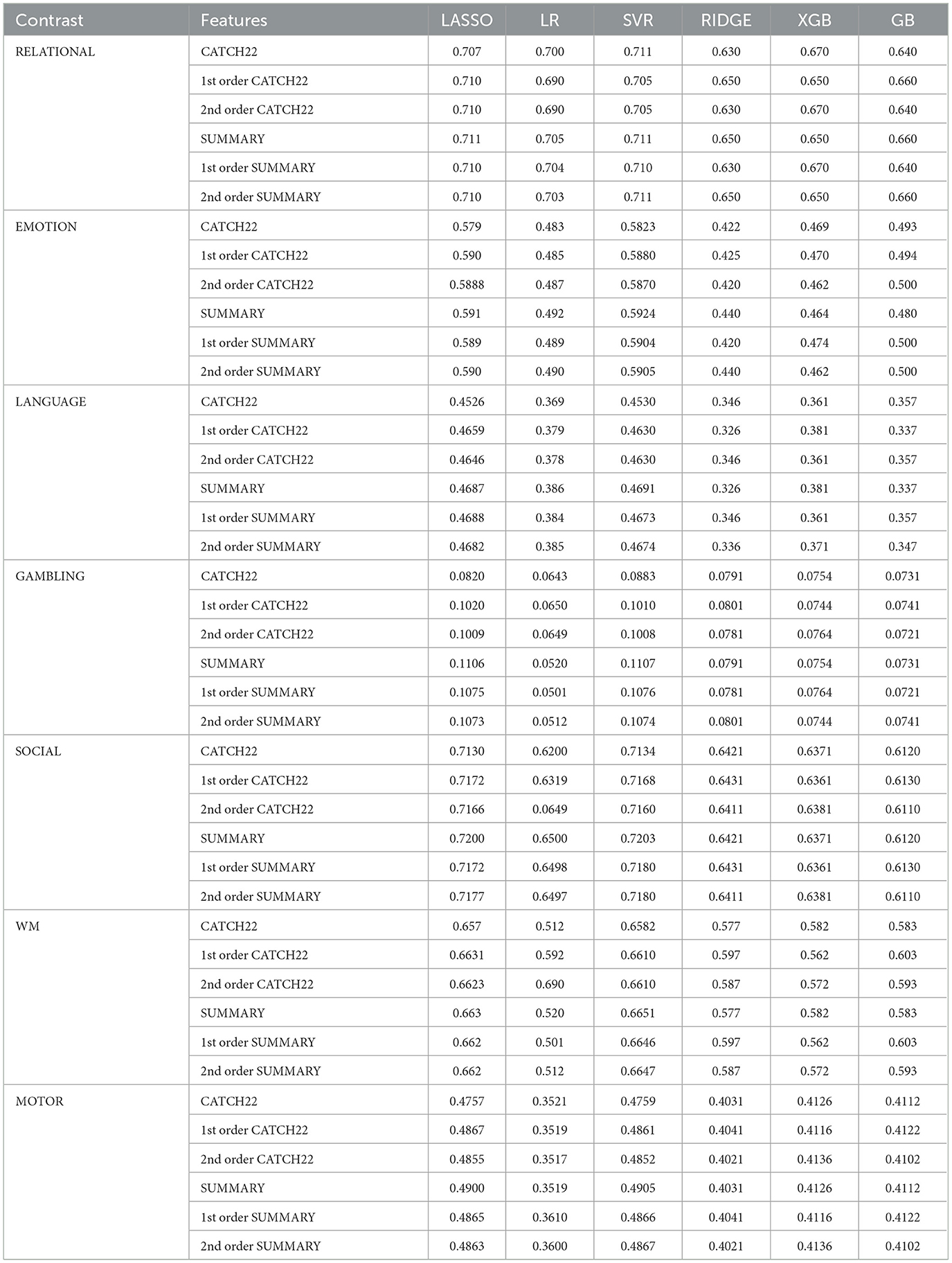 The comparative results in Table 8 show that CATCH22 and SUMMARY features achieved the best predictive performance, yielding higher correlations across task contrasts. Consequently, these two feature sets were selected for subsequent modeling of task activation maps.