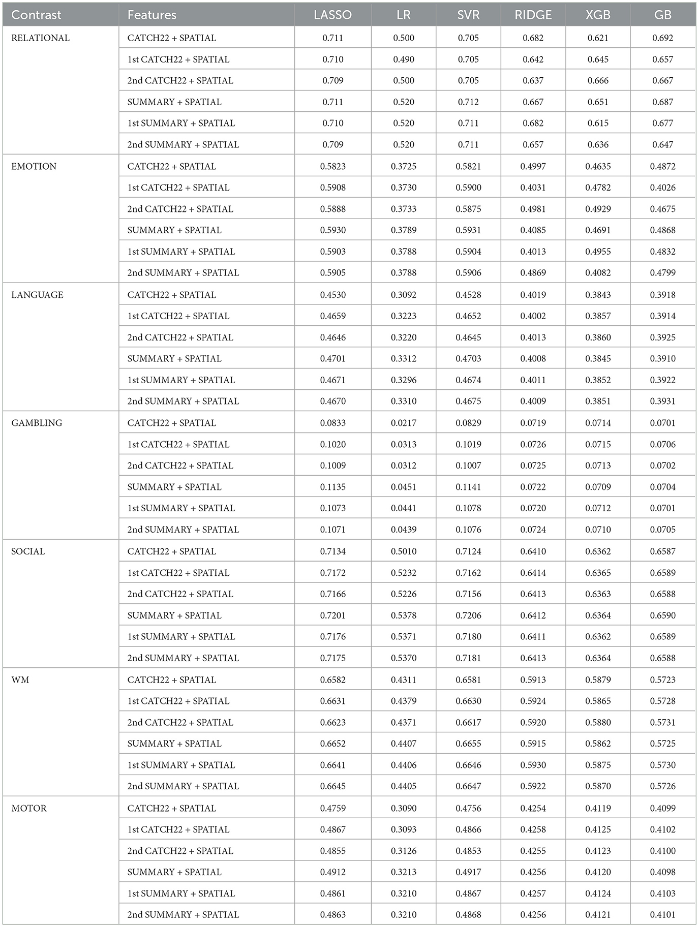 Finally, an ablation study was conducted to evaluate the performance of various regression models employed earlier using different combinations of temporal and spatial features across all contrasts. The features analyzed included histogram-based features (HIST), CATCH22 time series features, and SUMMARY statistical descriptors, each combined with spatial features. First and second derivatives of these temporal features were also incorporated to assess their incremental value. The results obtained for these different feature-regressor combinations are tabulated in Tables 7, 11. Following this, the same optimal selection strategy, as employed for the temporal features, was applied for these spatio-temporal feature sets. Performance metrics resulting from this procedure are presented in Table 12, which summarizes the optimal regression results across various cognitive task contrasts. These results demonstrate that the ensemble-based optimal feature selection approach using MSE again performs the best, providing significant improvements over individual feature sets. Furthermore, compared to spatial-only or temporal-only features, the use of spatio-temporal features enhances the predictive modeling of task-related brain activity, highlighting the value of combining spatial structure with temporal dynamics at the level of individual grayordinates.