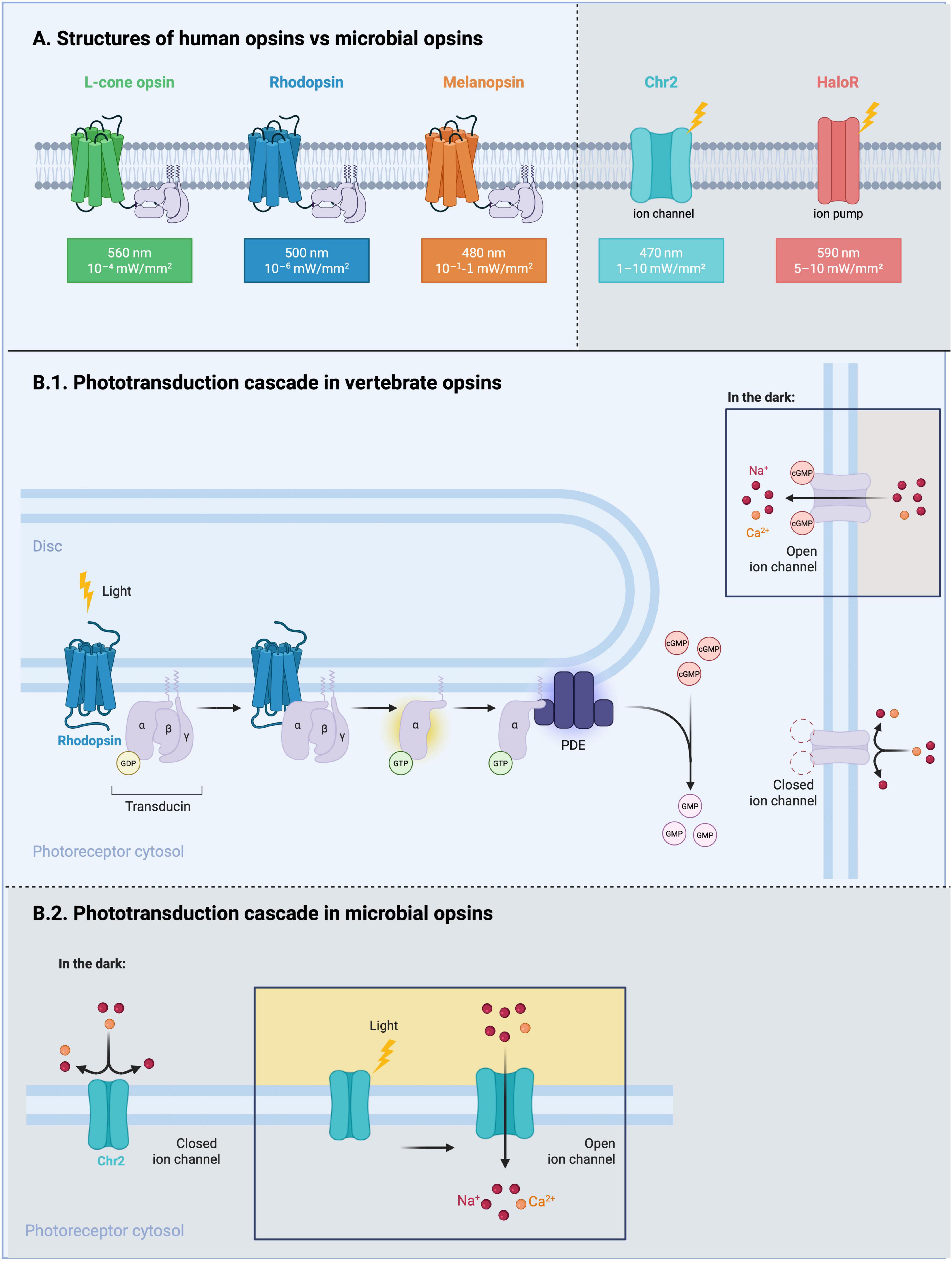 Figure 1. Structural and signaling differences between vertebrate and microbial opsins. (A) Structures of human opsins vs. microbial opsins. Transmembrane topologies of three human GPCR opsins: L-cone opsin (λmax ≈ 560 nm), rhodopsin (500 nm) and melanopsin (480 nm) are contrasted with the microbial channelrhodopsin-2 (ChR2, 470 nm) and halorhodopsin (HaloR, 590 nm). Approximate irradiances required for activation are indicated beneath each pigment. ChR2 functions as a light-gated cation channel, whereas HaloR operates as a light-driven ion pump. (B.1) Phototransduction cascade in vertebrate opsins. Photon capture by rhodopsin activates transducin, which stimulates phosphodiesterase-6, hydrolyzing cyclic guanosine monophosphate (cGMP). The ensuing cGMP decline closes plasma-membrane cyclic-nucleotide–gated Na+/Ca2+ channels, generating hyperpolarization. In darkness, elevated cGMP maintains these channels in an open state. (B.2) Phototransduction cascade in microbial opsins. Illumination directly opens ChR2, permitting Na+ and Ca2+ influx without second-messenger amplification. Thus, microbial opsins couple light absorption to ionic current in a unimolecular process, unlike the multistep vertebrate cascade. Created in BioRender. Bica, M. (2025) https://BioRender.com/bo0sd62.