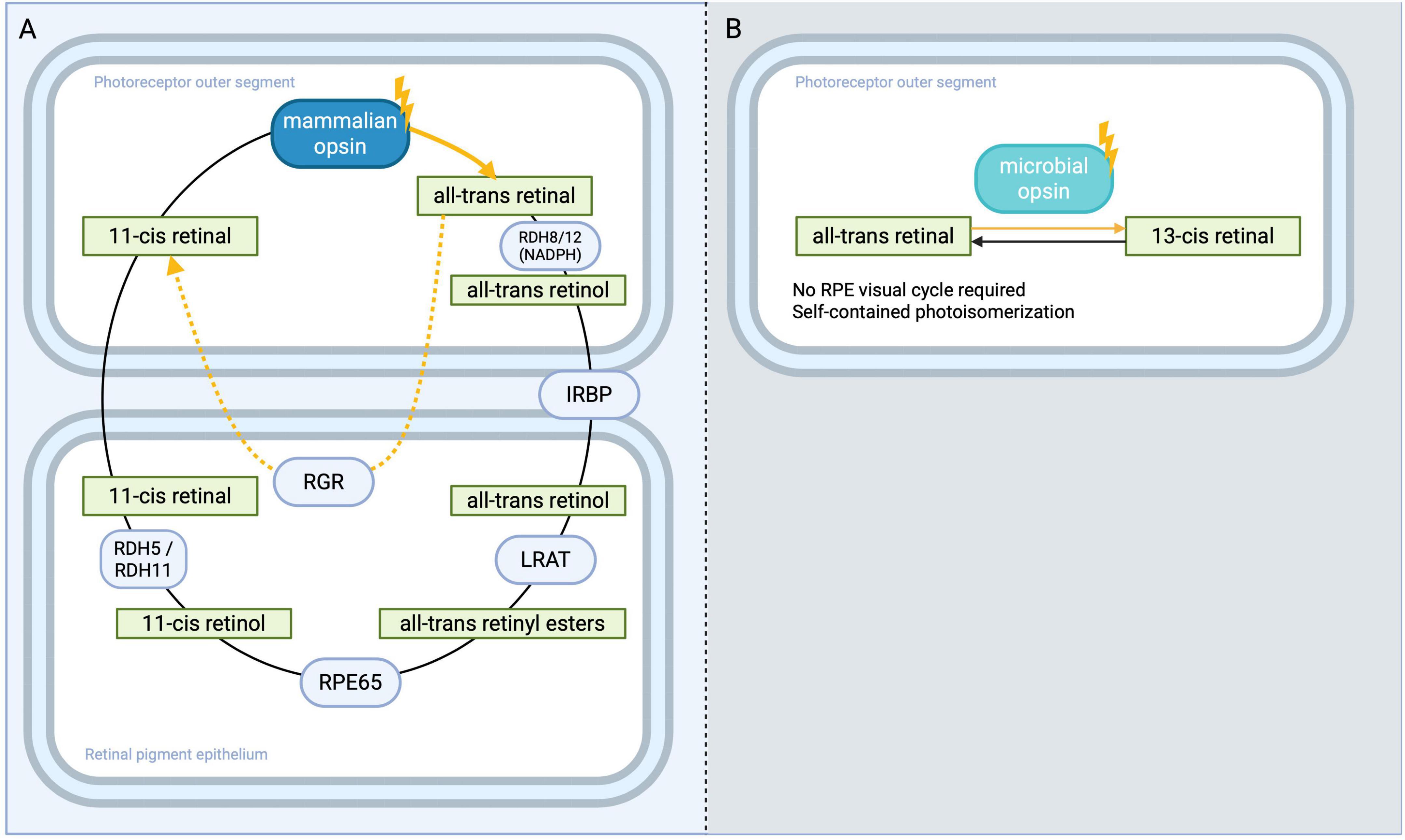 Figure 2. Chromophore regeneration in vertebrate versus microbial opsins. (A) Vertebrate visual cycle. Photon absorption (gold arrow) converts 11-cis retinal → all-trans retinal within the mammalian opsin (“bleaching”). The all-trans retinal is rapidly reduced by RDH8/12 (NADPH) to all-trans retinol and trafficked to the RPE via IRBP. In the RPE, LRAT esterifies retinol to all-trans retinyl esters; RPE65 then isomerises–hydrolyses these esters to 11-cis retinol, which RDH5/RDH11 oxidize to 11-cis retinal for return to the outer segment. A light-dependent auxiliary branch mediated by RGR-opsin in the RPE and a subset of Müller glia photoisomerizes all-trans retinal → 11-cis retinoids (gold arrows), augmenting the dark-active, enzyme-driven cycle (solid dark arrows). (B) Microbial photocycle. Microbial opsins contain a self-contained chromophore cycle: all-trans → 13-cis retinal upon illumination (gold arrow), followed by thermal relaxation 13-cis → all-trans (solid dark arrow), eliminating any requirement for the RPE visual cycle and supporting rapid, repetitive activation–deactivation. Created in BioRender. Bica, M. (2025) https://BioRender.com/hfvms3j.