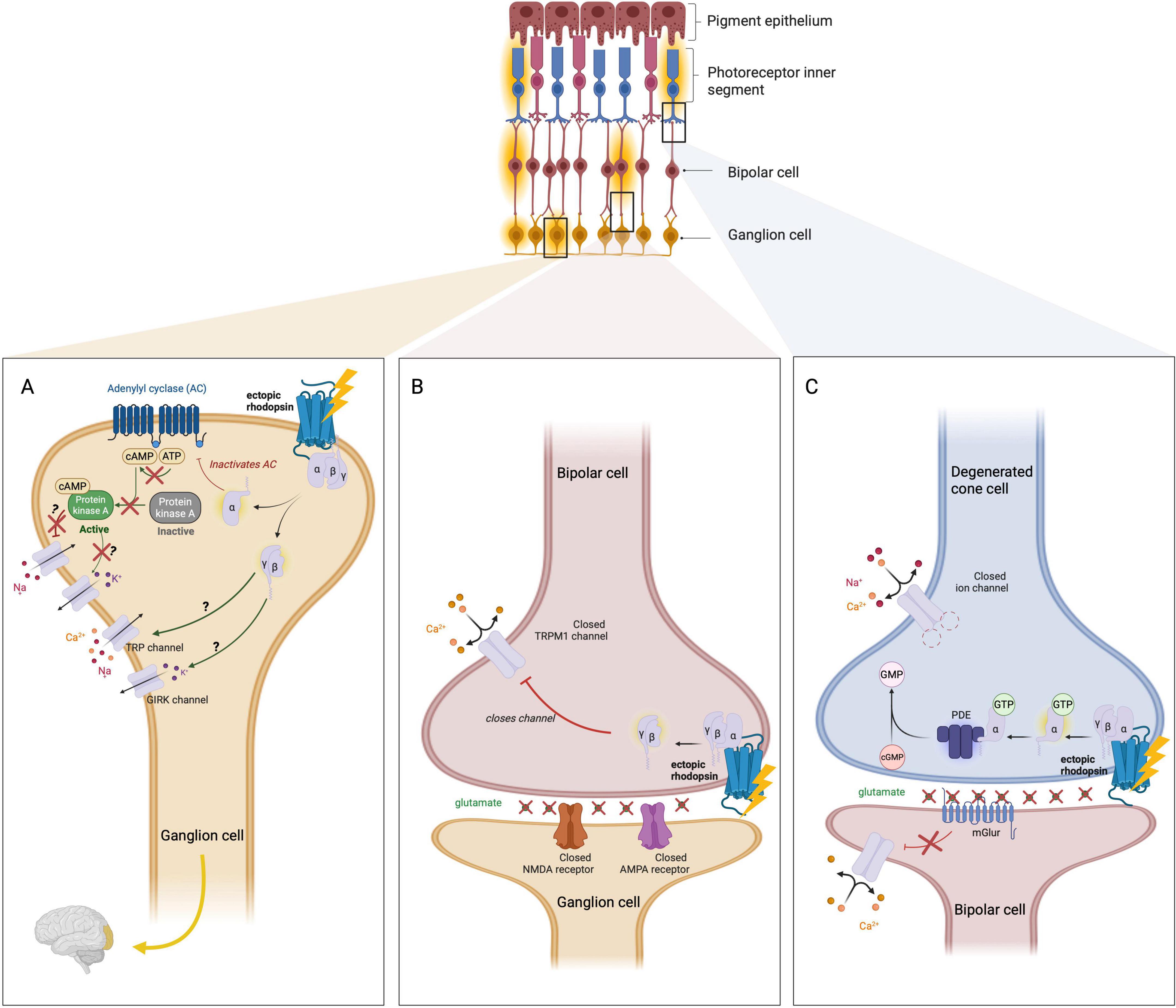 Figure 3. Molecular mechanisms of ectopic rhodopsin-mediated signaling for optogenetic vision restoration. Schematic representation of three contexts in which human rod opsin (rhodopsin) is expressed ectopically in the degenerated retina to restore light sensitivity. Top: Illustration of the retinal structure with expression of ectopic rhodopsin either ubiquitously, in retinal ganglion cells (RGCs), bipolar (BP) cells or in degenerated inner photoreceptor segments. (A) RGC expression. Ectopically expressed rhodopsin couples to endogenous Gi/o proteins. Upon light activation, the Gα subunit inhibits adenylyl cyclase (AC), reducing cAMP levels and inactivating protein kinase A (PKA), which may affect downstream ion channels. The freed Gβγ dimer can modulate ion conductances, potentially opening GIRK channels (leading to hyperpolarization) or altering TRP channel activity (which may depolarize the cell). Due to lack of native phototransduction machinery (e.g., PDE6, cGMP-gated channels), the net effect is cell-type-dependent and variable, but in some RGCs results in weak, light-evoked spiking. (B) ON-BP cell expression. Ectopic rhodopsin activates the native mGluR6 signaling cascade. Light-driven activation of Gi/o leads to Gβγ-mediated closure of TRPM1 cation channels, mimicking the effect of glutamate binding to mGluR6 in the dark. This results in hyperpolarization of the BP cell and a reduction in glutamate release onto downstream RGCs. Although the polarity of response is inverted compared to the native ON pathway, modulation of glutamate output is preserved. (C) Remnant cone photoreceptor expression. Light activation of ectopic rhodopsin triggers the canonical phototransduction cascade. Activated transducin (Gα) stimulates PDE, which hydrolyses cGMP, leading to closure of cGMP-gated cation channels in the outer segment membrane. This causes hyperpolarization and reduced glutamate release onto ON-BP cells. The downstream BP cell expresses mGluR6, which remains inactive in light, allowing TRPM1 channels to open and the cell to depolarize and thus preserving natural signal polarity. Created in BioRender. Bica, M. (2025) https://BioRender.com/hm4f3tn.