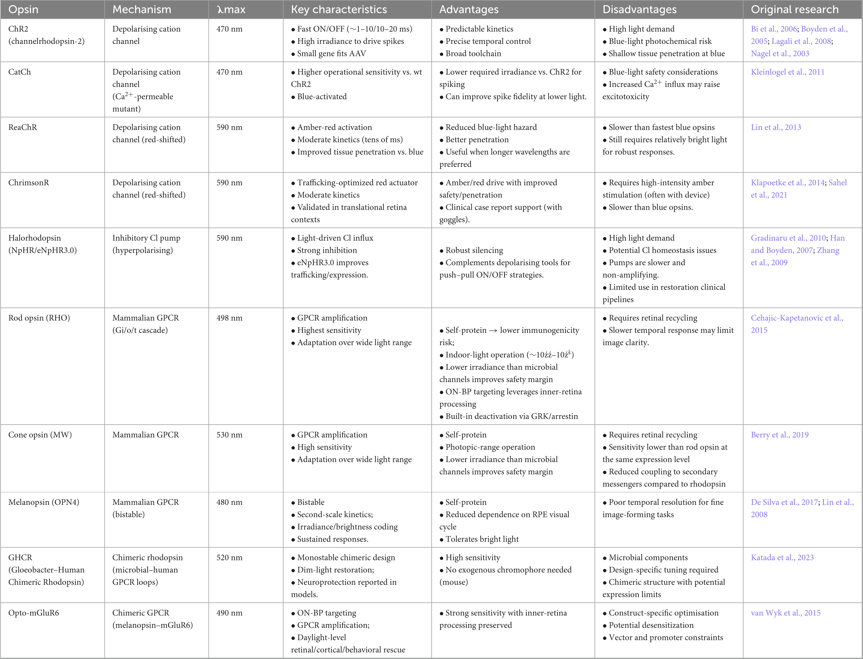 A hallmark of rod and cone opsins is their ability to trigger intracellular enzymatic cascades upon photon absorption, greatly amplifying the signal (Sakai et al., 2022; Figure 1). Microbial opsins are light-gated ion channels that lack signal amplification, each absorbed photon directly gates a single channel, yielding a limited current per molecule, unlike mammalian opsins (rod and cone opsin, melanopsin) which activate a G-protein coupled cascade, allowing for intrinsic signal amplification (Bi et al., 2006). Mammalian rhodopsin has exquisite light sensitivity with ability to detect a single photon of light. When fully dark adapted, humans can detect as few as 7–10 photons. The absorption of a single photon is sufficient to alter the membrane conductance through a cascade of amplification steps. A single photoactivated opsin activates tens of G proteins, each of which activates one effector, yielding thousands of second-messenger molecules modified. Classic amphibian estimates often quoted 500 transducin molecules per activated rhodopsin reflecting longer activated rhodopsin lifetimes at room temperature (Burns and Arshavsky, 2005). In mammalian rods, photoactivated rhodopsin is active for ∼40–50 ms and activates transducin at ∼3 × 10–2–1.3 × 103 molecules⋅s–1, i.e., ∼10–60 transducins per photon depending on preparation and temperature (Arshavsky and Burns, 2012; Chen et al., 2012; Heck and Hofmann, 2001). Each activated transducin then activates a PDE6 holoenzyme whose turnover is ∼3 × 103–5.6 × 103 cyclic guanosine monophosphate (cGMP)⋅s–1, so the integrated output per photon is on the order of 104–105 cGMP molecules hydrolyzed, closing ∼3%–5% of cyclic nucleotide-gated (CNG) channels and producing a ∼1 pA single-photon current in amphibian rods with a comparable fractional closure in mammals (Cote et al., 2021; Reingruber et al., 2015; Yau and Hardie, 2009). Representative microbial and mammalian opsins, together with their wavelength, mechanisms and key practical advantages and disadvantages, are summarised in Table 1.