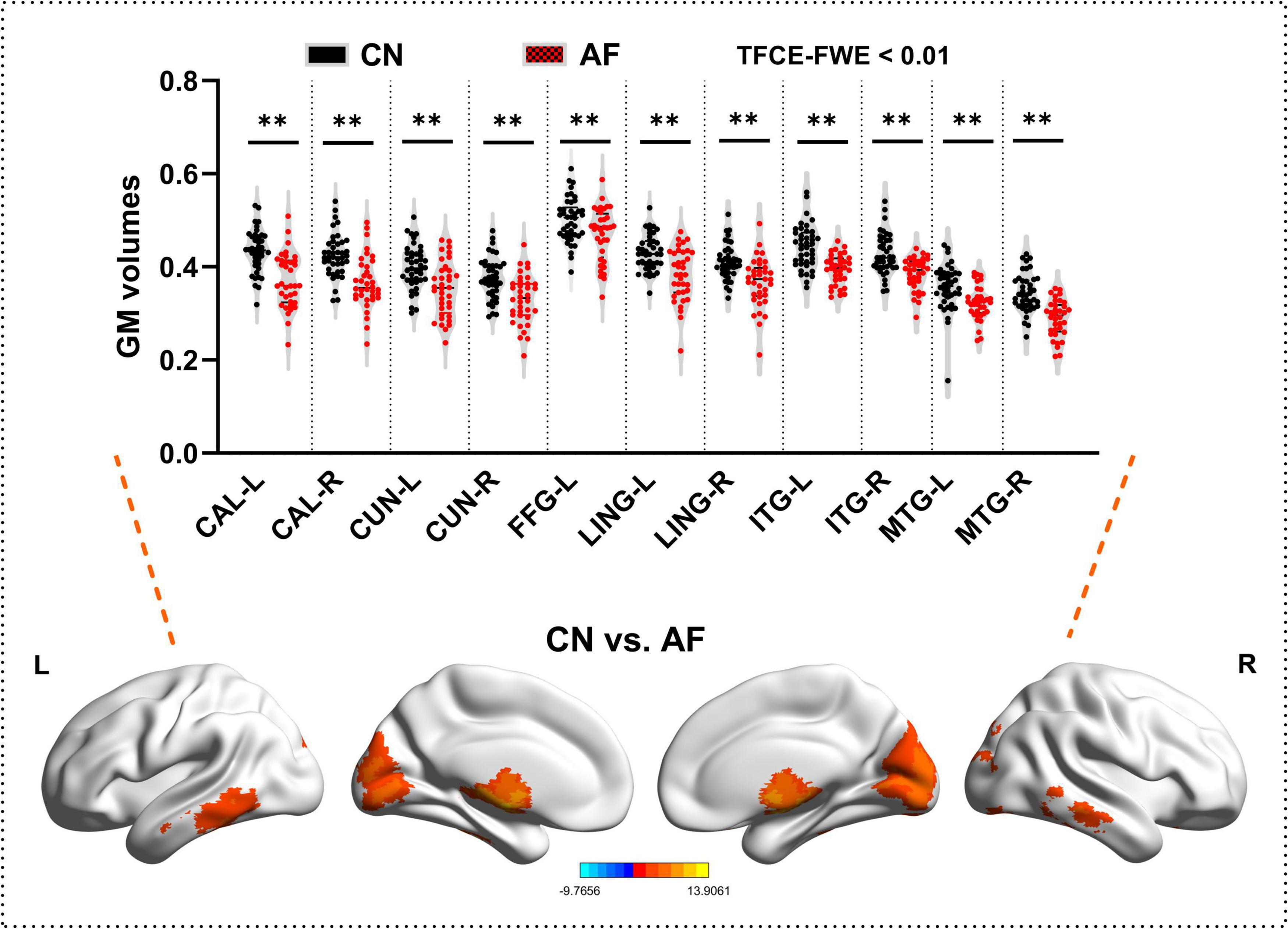 Figure 1. Grey matter differences between the AF group and CN group at baseline. The results from two-sample t-test are displayed using TFCE-FWE-corrected p < 0.01 and cluster extent k > 100 voxels (2,700 mm3). Results are presented after controlling for age and sex. **p < 0.01. L, left hemisphere; R, right hemisphere; AF, Atrial fibrillation; CN, healthy controls; GM, Gray matter; MTG, middle temporal gyrus; ITG, inferior temporal gyrus; FGG, fusiform gyrus; LING, lingual gyrus; CAL, calcarine fissure and surrounding cortex; CUN, cuneus.