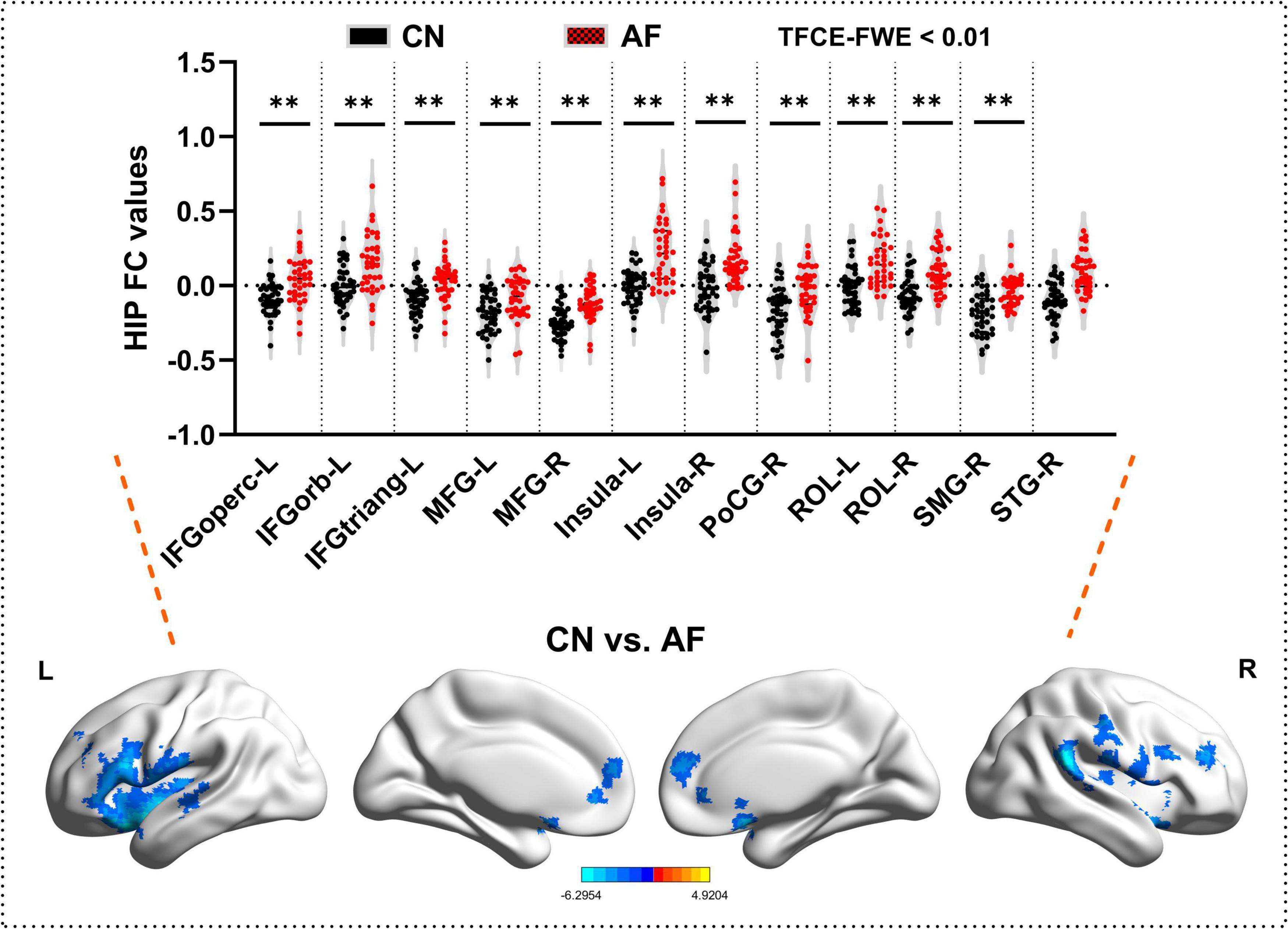 Figure 2. Hippocampal functional connectivity differences between the AF group and CN group at baseline. The results from two-sample t-test are displayed using TFCE-FWE-corrected p < 0.01 and cluster extent k > 100 voxels (2,700 mm3). Results are presented after controlling for age and sex. **p < 0.01. L, left hemisphere; R, right hemisphere; AF, Atrial fibrillation; CN, healthy controls. IFGoperc, Inferior frontal gyrus, opercular part; IFGtriang, Inferior frontal gyrus, triangular part; IFGorb, IFG pars orbitalis; MFG, middle frontal gyrus; PoCG, postcentral gyrus; ROL, rolandic operculum; SMG, supramarginal gyrus; STG, superior temporal gyrus.