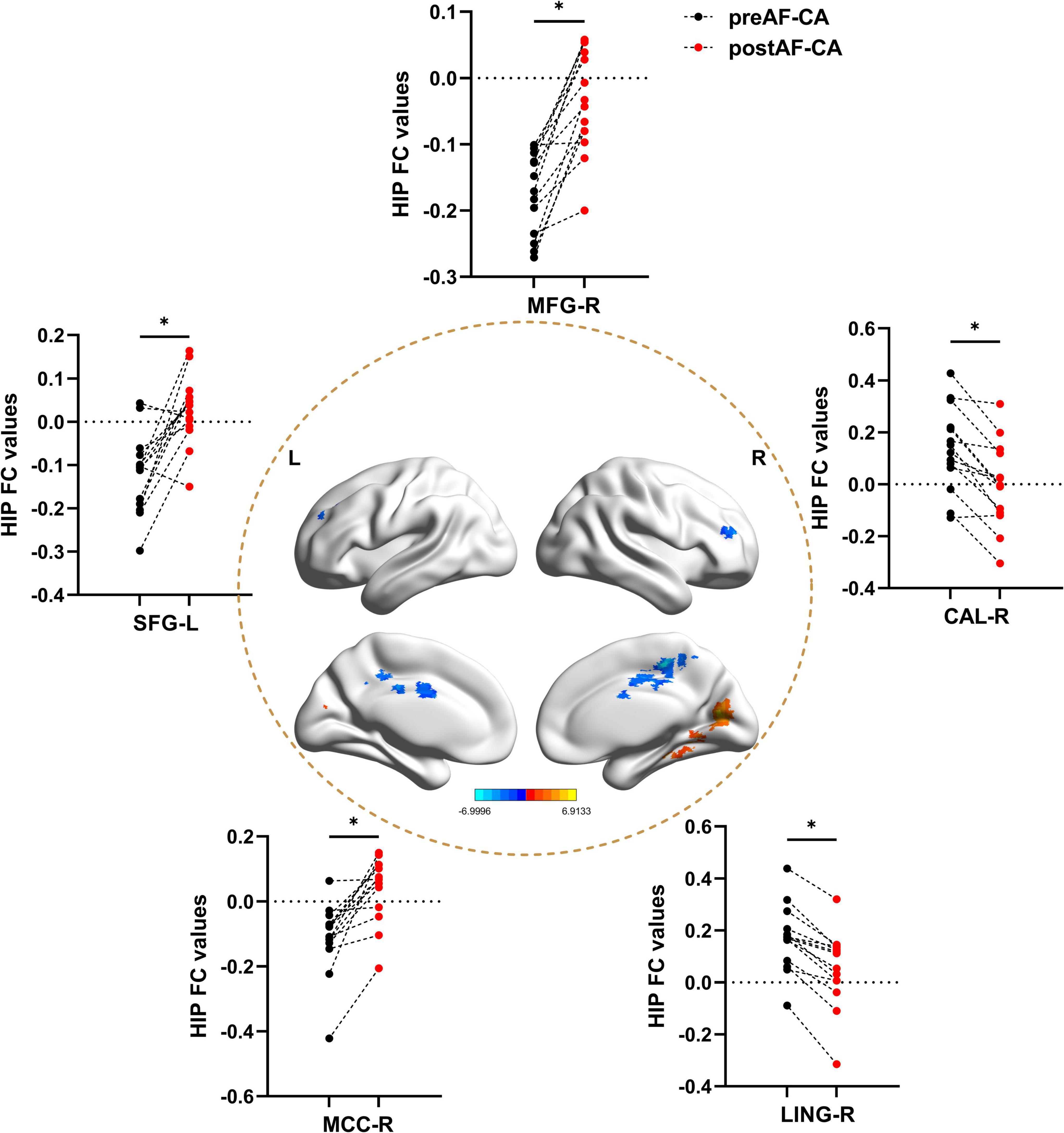 Figure 3. Hippocampal functional connectivity differences between patients with pre-operative and post-operative atrial fibrillation undergoing catheter ablation. All results were controlled for age, sex, and head motion at a threshold of p < 0.05 using TFCE correction with cluster size > 30 voxels (810 mm3). *p < 0.05. L, left hemisphere; R, right hemisphere; preAF-CA, patients with pre-operative atrial fibrillation undergoing catheter ablation; postAF-CA, patients with post-operative atrial fibrillation undergoing catheter ablation; MFG, middle frontal gyrus; SFG, superior frontal gyrus; CAL, Calcarine gyrus; MCC, Middle cingulate and paracingulate gyrus; LING, Lingual gyrus.