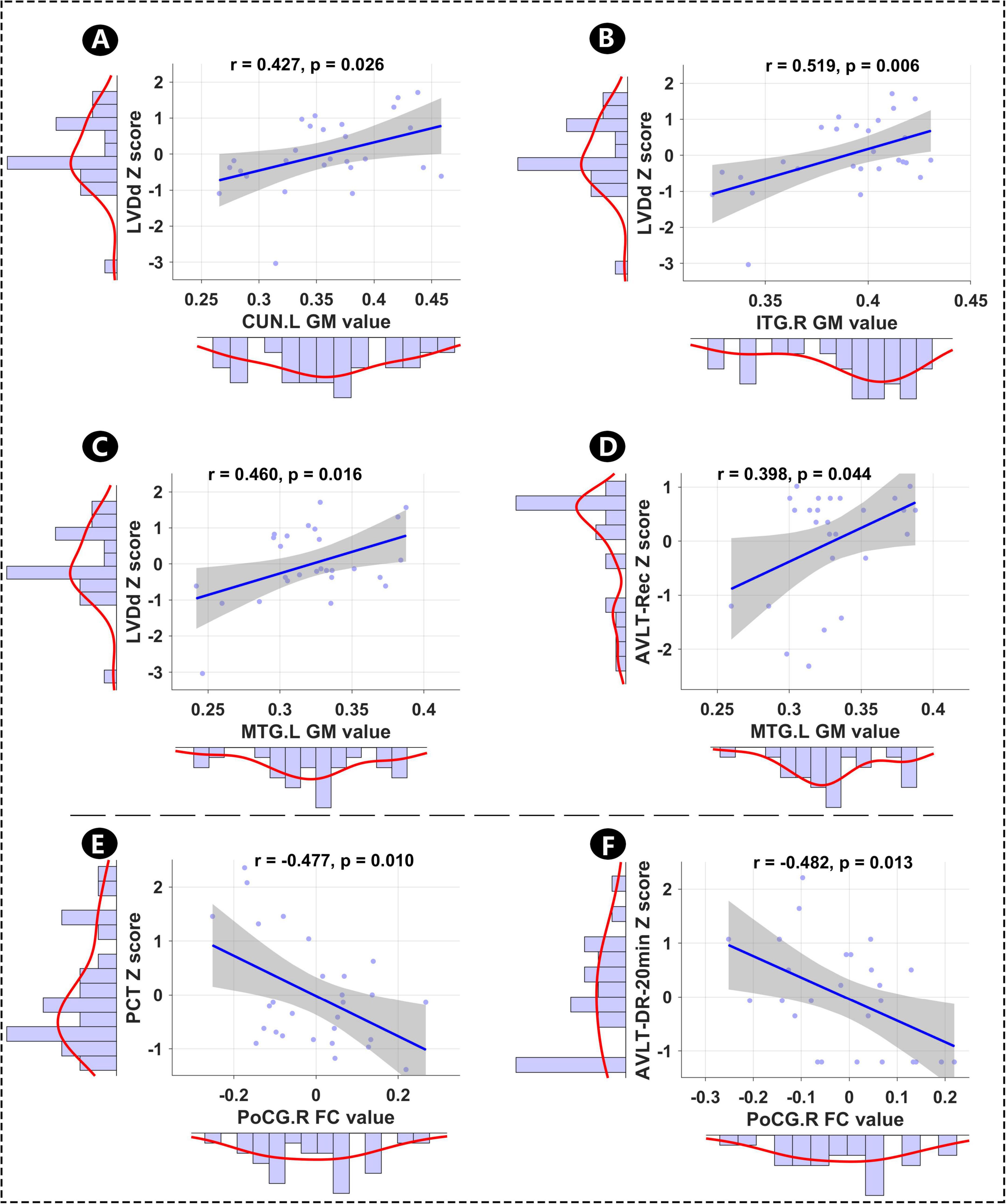 Figure 4. Relationships among mean altered GM, hippocampal FC, memory, and clinical features. (A–D) Relationships between altered GM and AVLT-Rec, and between altered GM and LVDd. (E,F) Relationships between hippocampal FC and PCT, and between hippocampal FC and AVLT-20 min-DR. LVDd, left ventricular end-diastolic dimension; L, left hemisphere; R, right hemisphere; CUN, cuneus; ITG, inferior temporal gyrus; PoCG, postcentral gyrus; MTG, middle temporal gyrus; PCT, procalcitonin; AVLT-Rec, auditory verbal learning test—recognition; AVLT-20 min-DR, auditory verbal learning test—20-min delayed recall; GM, gray matter; FC, functional conn.