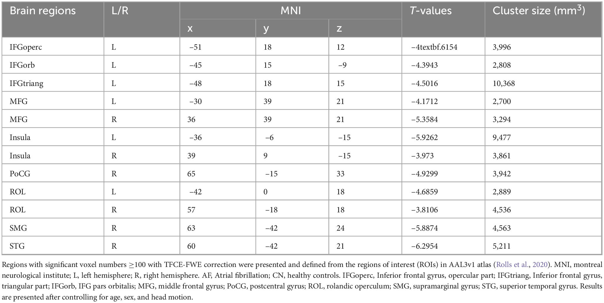As depicted in Figure 2 and Table 3, AF group exhibited significantly increased FC in bilateral MFG, bilateral Insula, bilateral ROL, left IFGoperc, left IFGorb, left IFGtriang, right PoCG, right SMG, and right STG (TFCE-FWE-corrected P < 0.01 and cluster extent k > 100 voxels).