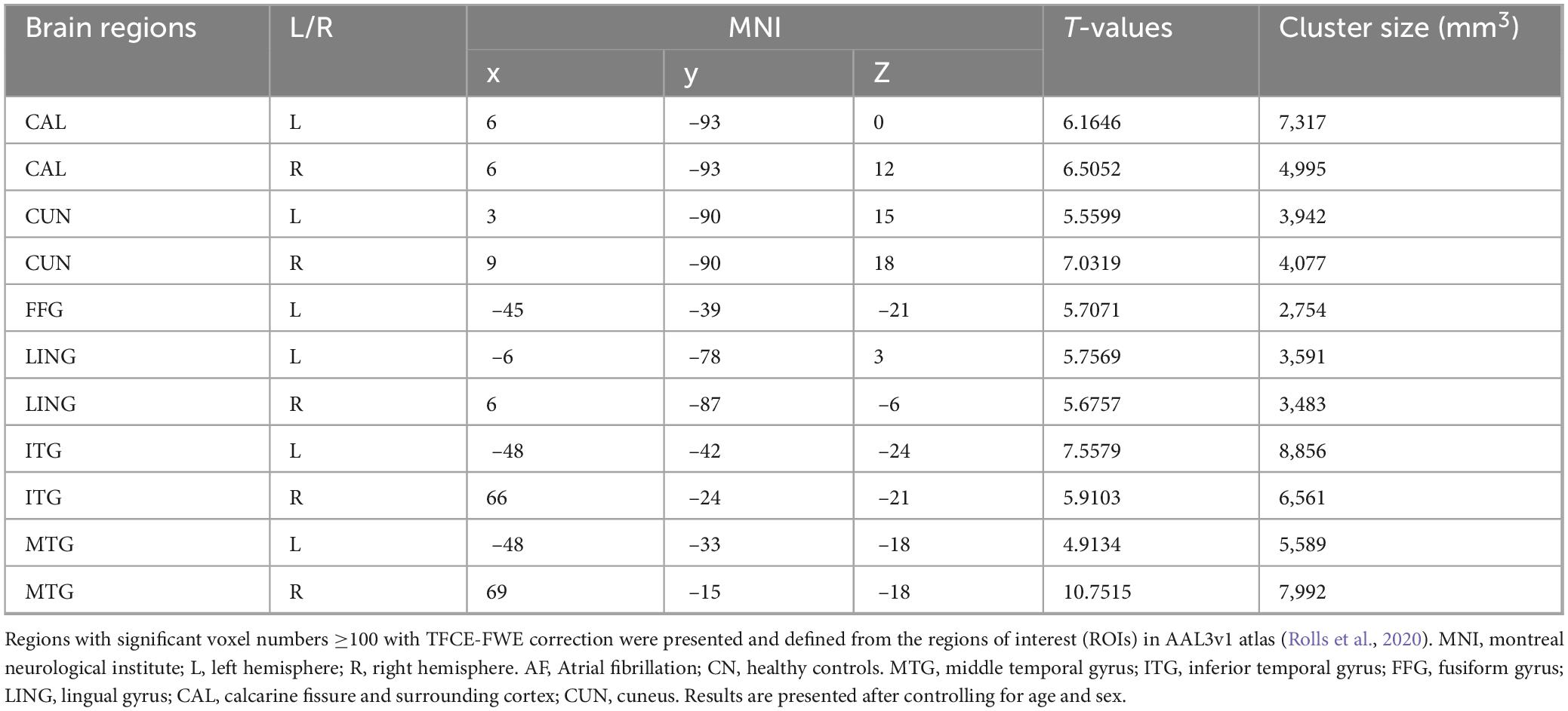 As depicted in Figure 1 and Table 2, AF group exhibited significantly decreased GM in bilateral CAL, CUN, LING, ITG, MTG, and left FFG that CN group (TFCE-FWE-corrected P < 0.01 and cluster extent k > 100 voxels).