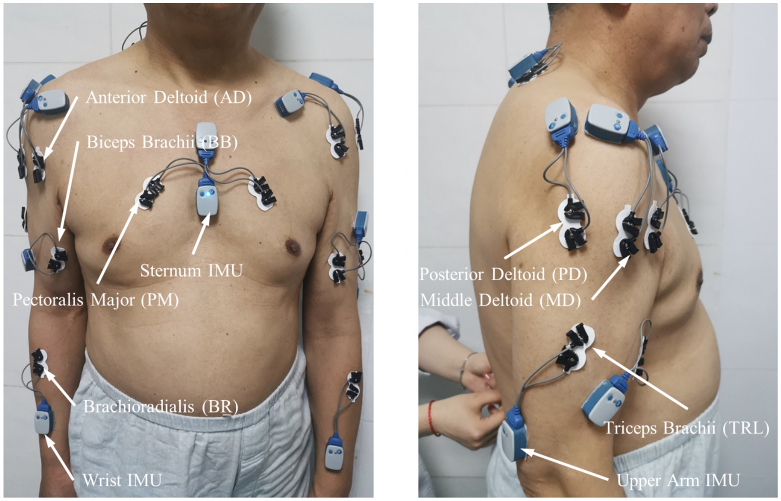 All movements were completed during a single laboratory visit, with synchronous acquisition of surface electromyography (sEMG) and inertial measurement unit (IMU) data. sEMG signals were recorded at 2000 Hz using a wearable system (Noraxon USA, Inc., Scottsdale, AZ, United States) from seven upper limb muscles: Brachioradialis (BR), Biceps Brachii (BB), Triceps Brachii Lateral Head (TRL), Anterior Deltoid (AD), Middle Deltoid (MD), Posterior Deltoid (PD), and Pectoralis Major (PM). Bipolar Ag-AgCl circular surface electrodes, spaced 2 cm apart, were placed longitudinally over the muscle belly center according to recommendations from the International Society of Electrophysiology and Kinesiology (ISEK), following shaving and alcohol cleansing. IMU modules recorded data at 400 Hz and were fixed to the sternum, upper arm, and wrist. Data were wirelessly transmitted via Bluetooth to a host computer for synchronized storage and processing. The placement of sensors and electrodes is illustrated in Figure 1.