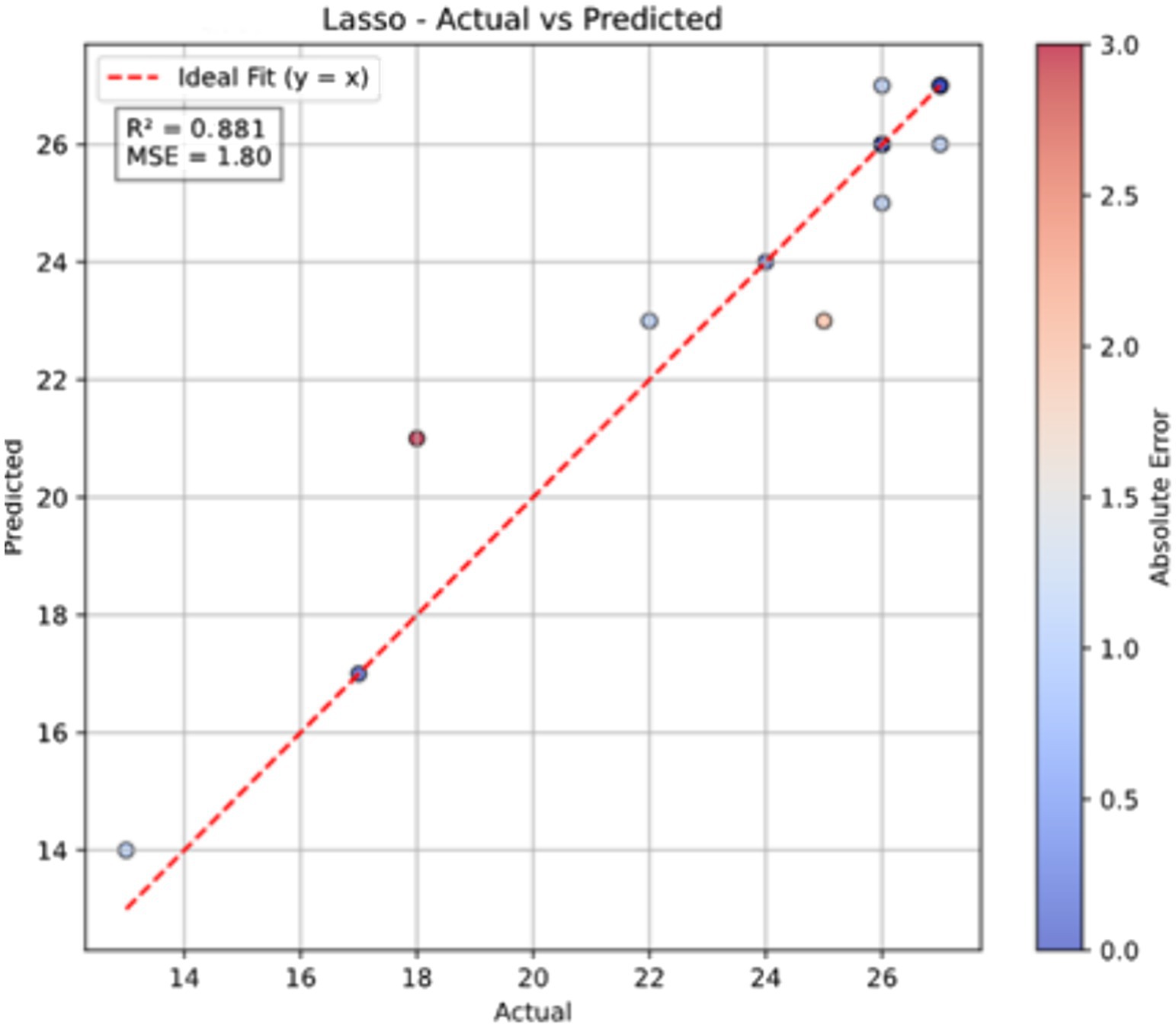 On the more challenging independent test set, the Lasso model achieved the highest coefficient of determination (R2 = 0.881) and the lowest Mean Squared Error (MSE = 1.802) and Mean Absolute Error (MAE = 0.954). This indicates the model possesses strong generalization capability. Figure 2 illustrates the relationship between the predicted values from the Lasso model and the actual FMA-UL scores on the independent test set. Data points are tightly clustered around the ideal fit line (y = x), visually confirming the model’s high predictive accuracy. Furthermore, the color of the scatter points represents the absolute error, with most points skewed toward blue (low error), further demonstrating that the model’s predictions are reliable at the individual level.