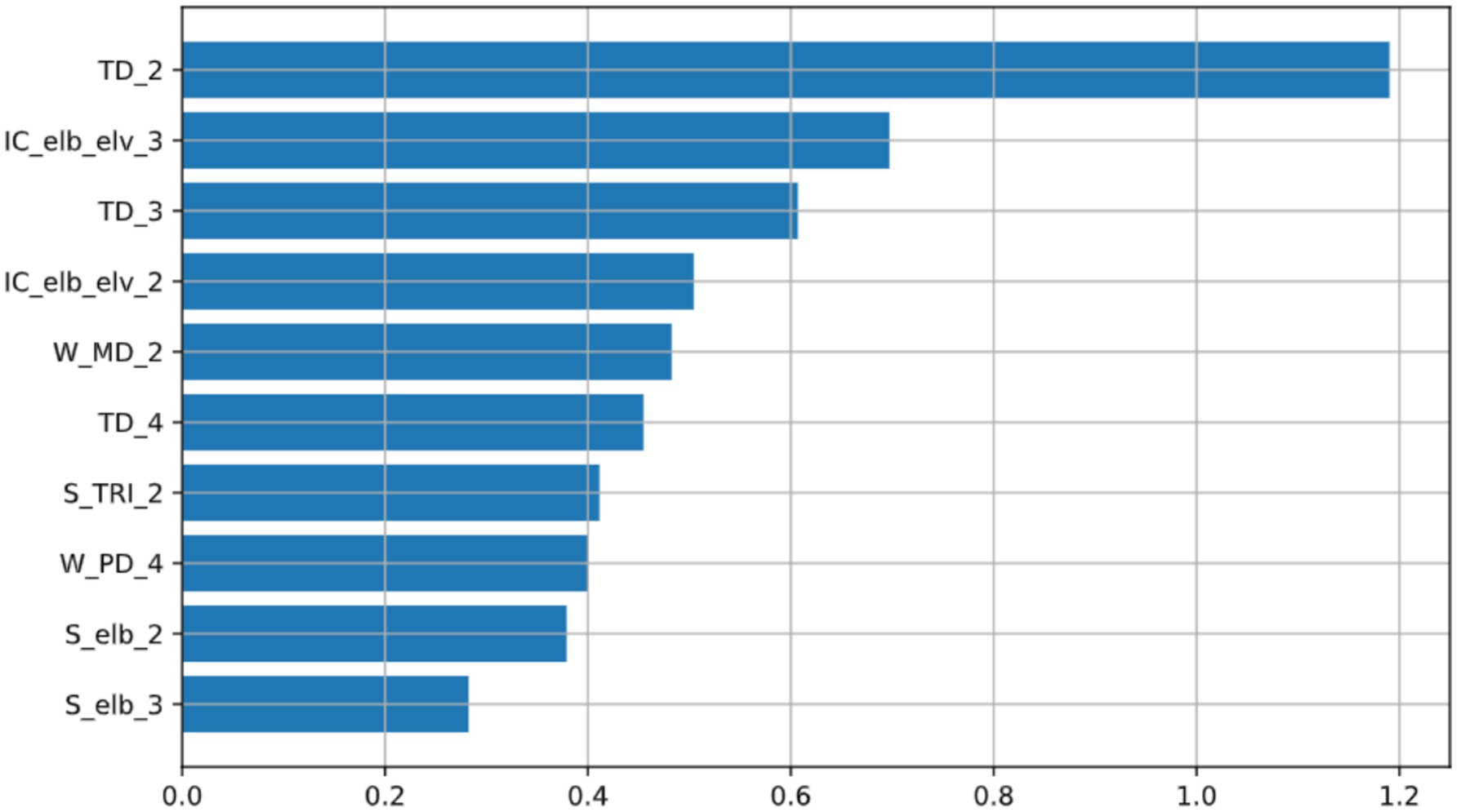 To understand how the Lasso model makes predictions, we first analyzed its internal structure. Figure 3 displays the 10 features with the largest absolute Lasso regression coefficients (weights) in the final model. As the plot indicates, TD_2 (trunk displacement in phase 2) has the largest coefficient, underscoring its prominent role in the model’s structural composition, followed by IC_elb_elv_3 (elbow–shoulder coordination in phase 3) and TD_3 (trunk displacement in phase 3).