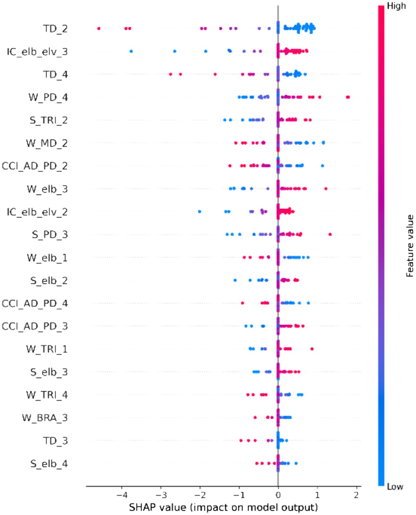 Figure 5A shows a sample with a high predicted score [ = 27.26]. For this patient, multiple features (red) acted in concert to push the predicted score above the base value, with the most impactful factors including CCI_AD_PD_4, CCI_AD_PD_2, and S_elb_2. The only significant negative factor (blue) was CCI_AD_PD_3. Figure 5B, in contrast, shows a sample with a low predicted score [ = 20.52]. This prediction is significantly lower than the base value. The main driving factors (blue) for this lower prediction include features such as IC_elb_elv_2, W_TRI_1, and S_TRI_2. Meanwhile, features like W_elb_3 and W_TRI_4 (red) prevented the score from being even lower to some extent. These individualized explanations are crucial for clinically understanding the specific functional impairment patterns of a given patient.